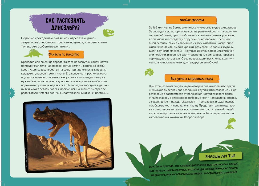Тебе выпал шанс отправиться поиски динозавров. Ты узнаешь, где сохранились окаменелые остатки этих древних ящеров, как палеонтологи сохраняют и реконструируют их скелеты, какой была наша планета в те далекие времена, когда на земле царили динозавры. Ты познакомишься со свирепыми аллозаврами и тираннозаврами, мирными диплодоками и брахиозаврами, а также древними птицами и обитателями морей.| Издательство | Махаон |