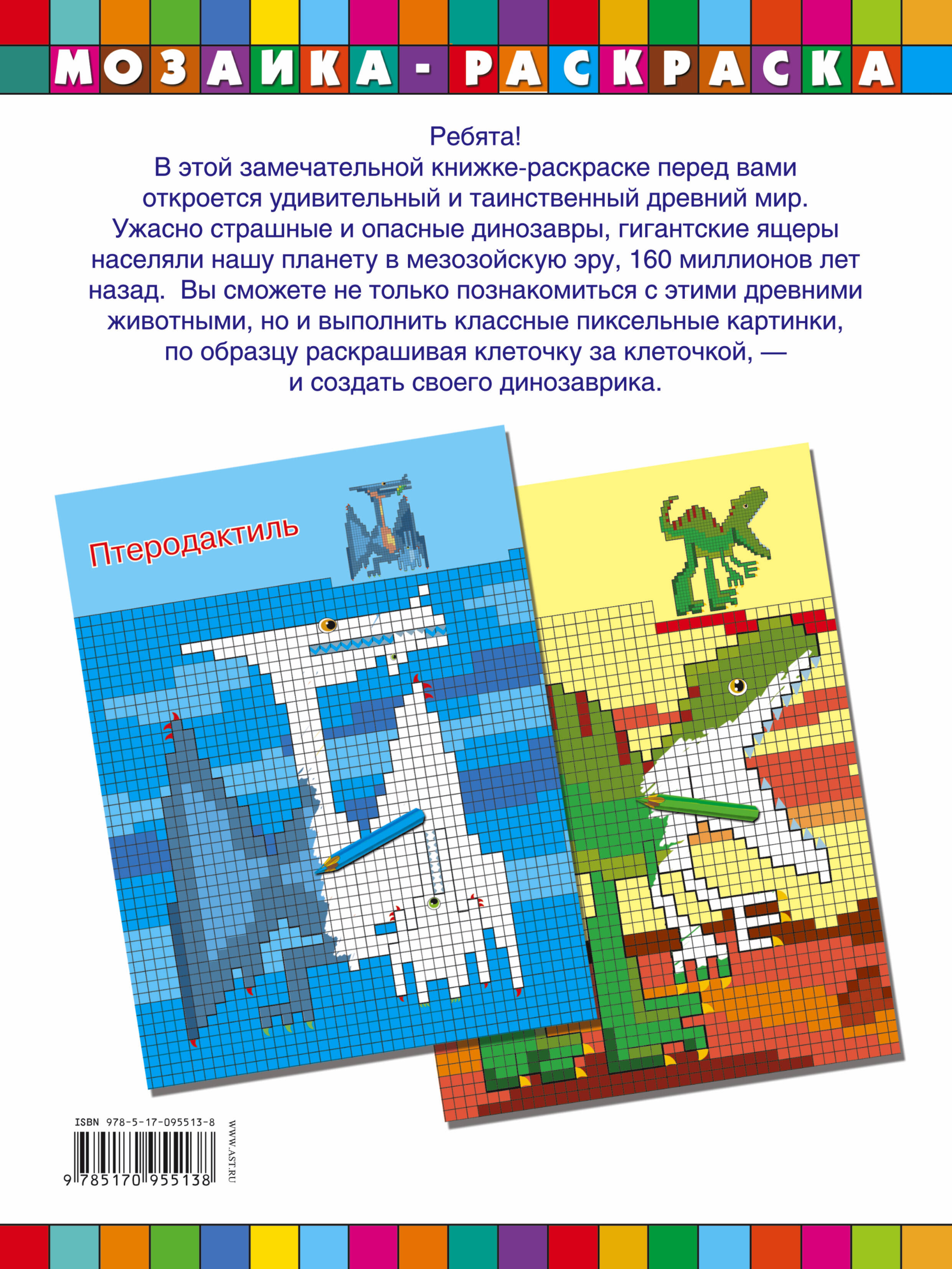 В книжке-раскраске с пиксельными картинками ребенок сможет создавать необычные рисунки динозавров, состоящие из более 600 клеточек. На каждой странице книги юный художник найдет образец рисунка. Раскрашивая клеточку за клеточкой, он сможет создать своего динозаврика. Занятия по книге-раскраске будут способствовать разностороннему развитию ребенка. Для младшего школьного возраста. УТП Впервые на книжном рынке новая серия - "Умная раскраска". Книга, которую вы держите в руках, - занимательная, полезная игра и одновременно развивающая раскраска. Это книга пиксельных картинок по клеточкам для юных художников и настоящих фантазеров. • Творческие уроки тренируют мелкую моторику, развивают образное мышление и воображение, сообразительность и логику. • Раскрашивание по пикселям развивает личностные качества - старательность, усердие и аккуратность. • Книжка помогает раскрыть творческий потенциал ребенка, дарит ему множество положительных эмоций.| Издательство | ИЗДАТЕЛЬСТВО "АСТ" |