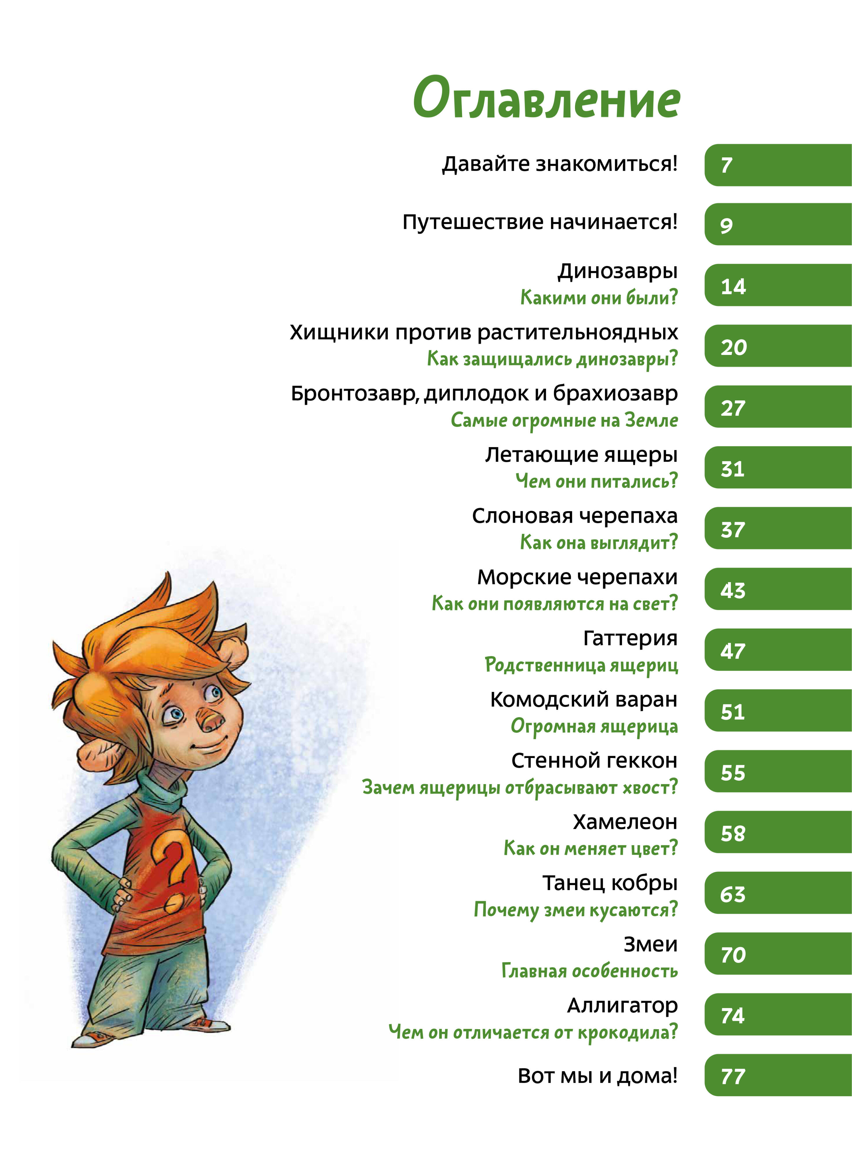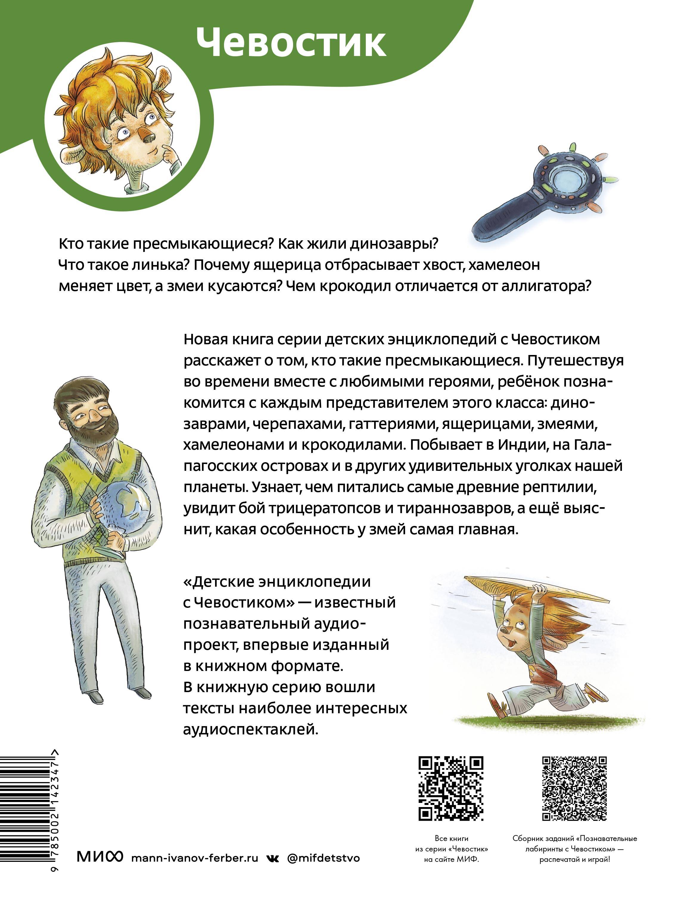 Продолжение серии детских энциклопедий с Чевостиком. Вместе с любимыми героями, ребенок отправится в путешествие во времени, познакомится с представителями класса пресмыкающихся: с динозаврами, гаттериями, ящерицами, хамелеонами и крокодилами. Побывает в Индии, Галапагосских островах, Новой Зеландии и других удивительных уголках нашей планеты. Узнает, чем питались самые древние рептилии, увидит бой трицератопсов и тираннозавров, поплавает в океане вместе с морскими черепахами, и выяснит, какая у змей самая главная особенность. Кто такой Чевостик? Текст для раздела"Детские энциклопедии с Чевостиком" - серия познавательных книг, объединенных общим персонажем. Они рассказывают о самых разных явлениях нашего мира. Чевостик - симпатичный герой, родом из известного аудиопроекта. Сегодня ребята знают его по энциклопедиям. В серии продолжают выходить книги, которые объяснят детям устройство мира. Дети гораздо лучше воспринимают информацию, когда о мире им рассказывает какой-нибудь сказочный персонаж. Именно поэтому девчонки и мальчишки так любят подобные энциклопедии. Чевостик - маленький человечек, который вместе со своим дядей Кузей совершает удивительные путешествия в мир наук: физики, химии, астрономии, анатомии, геологии и других. Он рассказывает детям о великих географических открытиях, покорении космоса и волшебных химических превращениях. Фишки книги: - новая энциклопедия с любимым героем - Чевостиком; - очень красивые иллюстрации; - серия с Чевостиком - одна из лучших серий энциклопедий для подготовки и адаптации детей к школе; - малыш узнает, почему ящерицы отбрасывают хвост, чем отличается крокодил от аллигатора, зачем зеленые морские черепахи выходят на сушу, почему змеи кусаются и многое другое; - Вместе с главными героями ребенок побывает в Индии, Галапагосский островах, Новой Зеландии и в других удивительных уголках нашей планеты. - множество идей для увлекательных занятий. Для кого эта книга: Для всех фанатов Чевостика. Для любознательных детей в возрасте от 4 до 9 лет.| Издательство | МАНН, ИВАНОВ И ФЕРБЕР ООО |