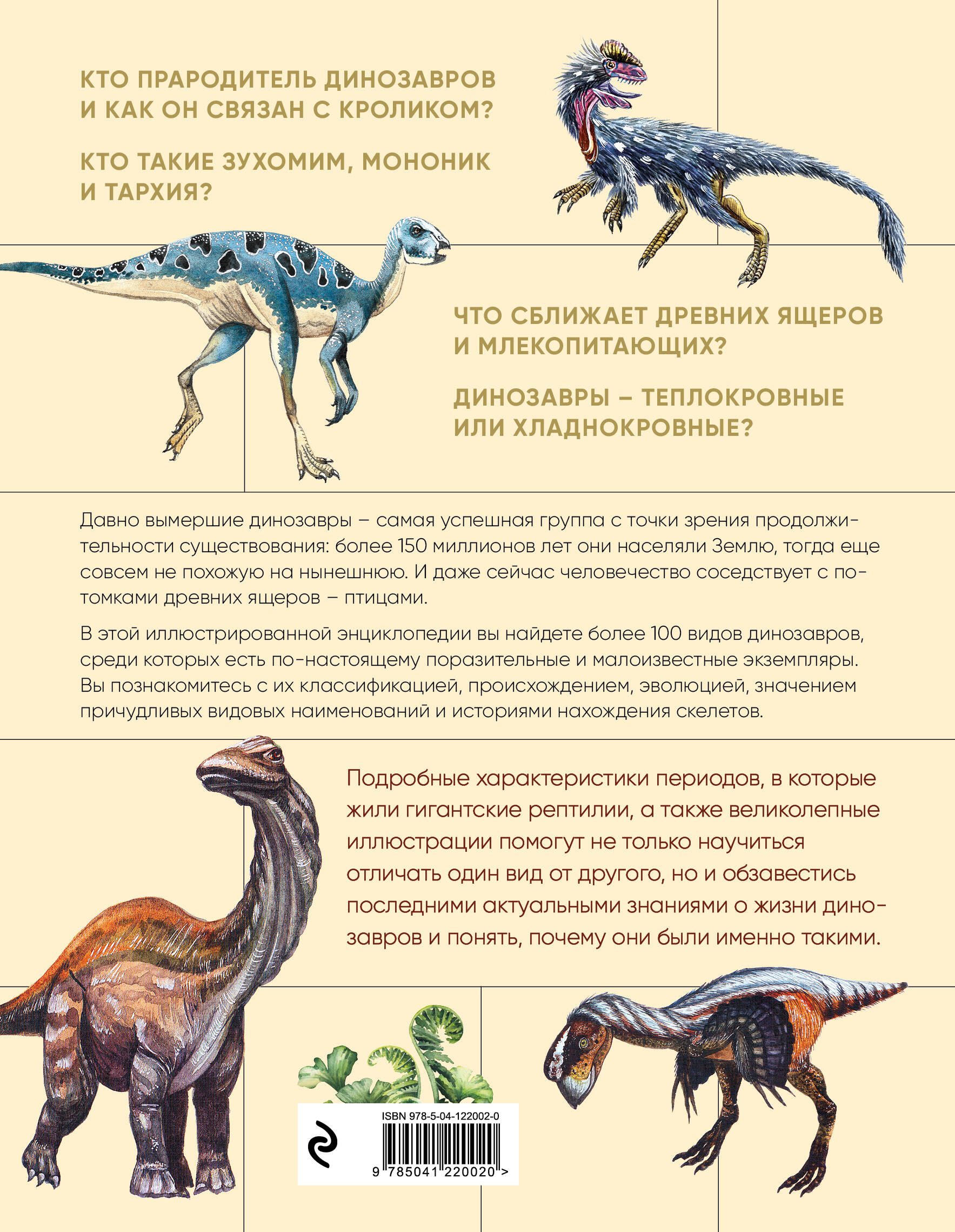 Трудно представить, что давно вымершие динозавры - по-прежнему самая успешная группа с точки зрения продолжительности существования: более 150 миллионов лет они населяли Землю, тогда еще совсем не похожую на нынешнюю. И даже сейчас, когда эпоха гигантских ящеров давно позади, человечество соседствует с потомками динозавров - птицами - уже лишь отдаленно напоминающими ужасающих древних предков. В этой иллюстрированной энциклопедии вы найдете более 100 видов динозавров, среди которых есть по-настоящему поразительные и малоизвестные экземпляры. Вы познакомитесь с их классификацией, происхождением, эволюцией, значением причудливых видовых наименований и историями нахождения скелетов. Подробные описания триасового, юрского и мелового периодов, климатических изменений, происходивших в это время, флоры и фауны, населяющей Землю, помогут наиболее полно представить эпоху господства древних ящеров и понять, почему они были именно такими. Огромное количество актуальной информации о жизни динозавров поможет разобраться в множестве вопросов: - Были динозавры теплокровными или хладнокровными? - Существовали ли динозавры, заботящиеся о потомстве? - Живородящие динозавры - возможно ли такое? - Кто был прародителем динозавров? А великолепные акварельные иллюстрации, которые хочется долго рассматривать, пробудят воображение!