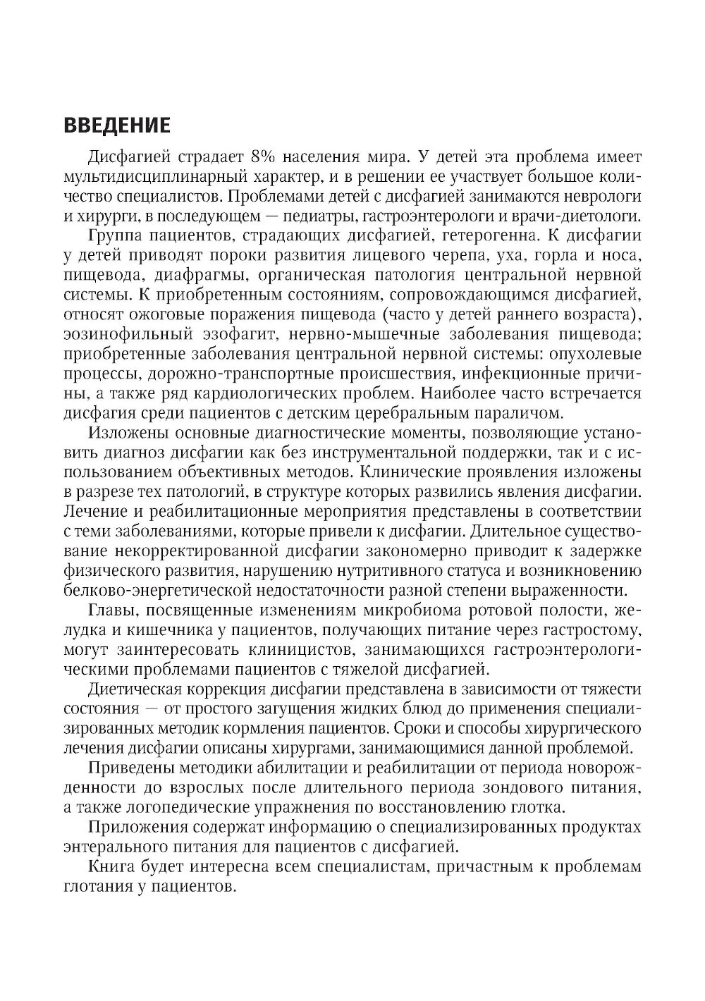 В издании рассмотрены диагностика, возможные пути коррекции нарушения глотания и осложнений этого процесса, поскольку возрастает число пациентов с дисфагией, у которых терапия и реабилитационные мероприятия начинаются с глубоким опозданием, когда уже развились осложнения. Наиболее полноценное издание, включающее не только физиологию глотания и его нарушение, но и приводящие к нему причины, а также способы диагностики, коррекции, реабилитации и абилитации пациентов детского возраста. Книга содержит методики диагностики дисфагии - от простых до сложных инструментальных методов; возможные пути коррекции заболевания в зависимости от причины дисфагии; нутритивную поддержку пациента, реабилитацию и мероприятия ухода; пошаговую инструкцию по восстановлению/активации глотания у детей раннего возраста (метод Кастильо Моралеса). Издание предназначено неврологам, хирургам, педиатрам, гастроэнтерологам, врачам-диетологам, клиницистам, реабилитологам и логопедам.| Издательство | ГЭОТАР-Медиа |