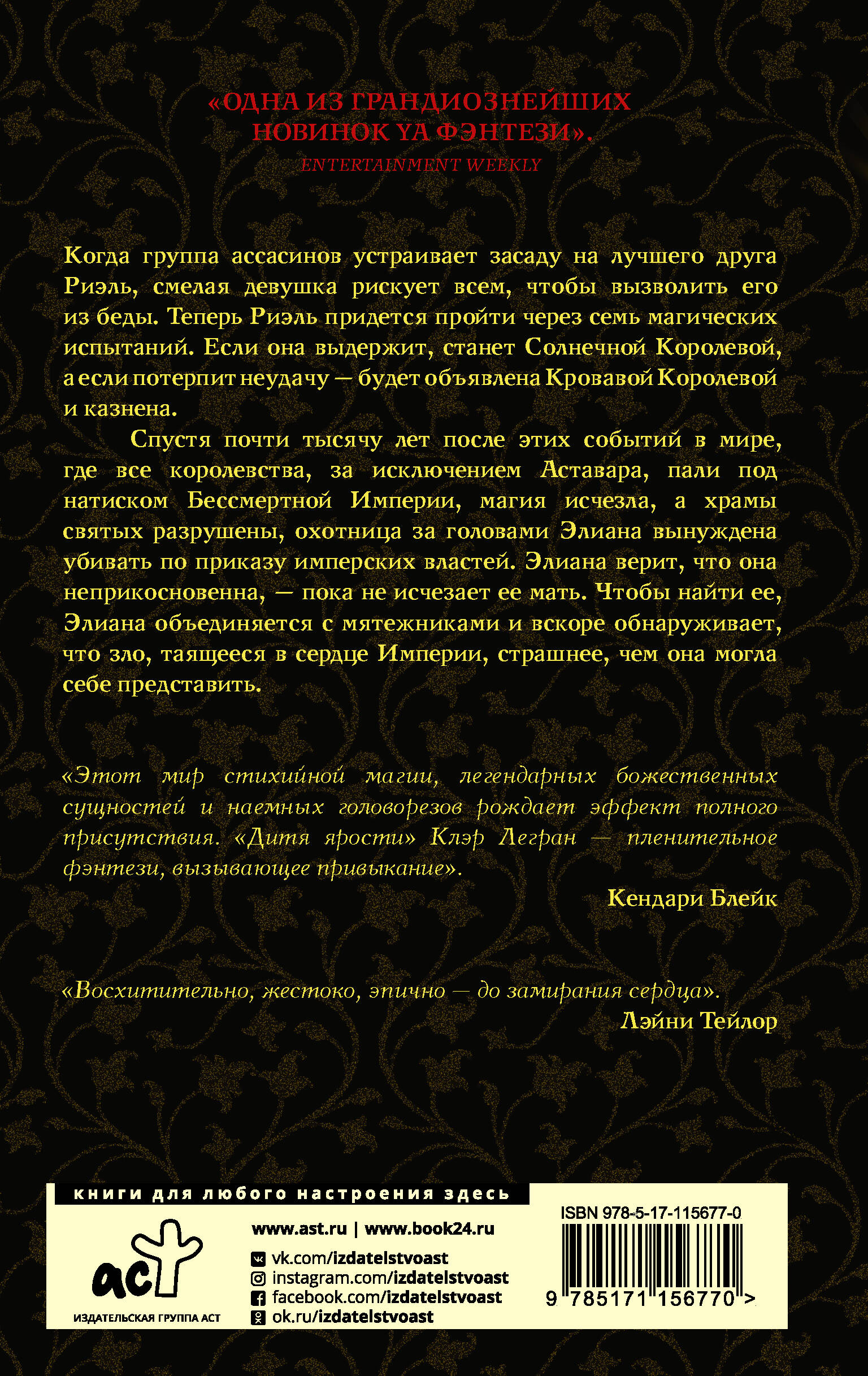 Когда группа ассасинов устраивает засаду на лучшего друга Риэль, смелая девушка рискует всем, чтобы вызволить его из беды. Теперь Риэль придется пройти через семь магических испытаний. Если она выдержит, станет Солнечной Королевой, а если потерпит неудачу - будет объявлена Кровавой Королевой и казнена. Спустя почти тысячу лет после этих событий в мире, где все королевства, за исключением Аставара, пали под натиском Бессмертной Империи, магия исчезла, а храмы святых разрушены, охотница за головами Элиана вынуждена убивать по приказу имперских властей. Элиана верит, что она неприкосновенна, - пока не исчезает ее мать. Чтобы найти ее, Элиана объединяется с мятежниками и вскоре обнаруживает, что зло, таящееся в сердце Империи, страшнее, чем она могла себе представить.| Издательство | ИЗДАТЕЛЬСТВО "АСТ" |