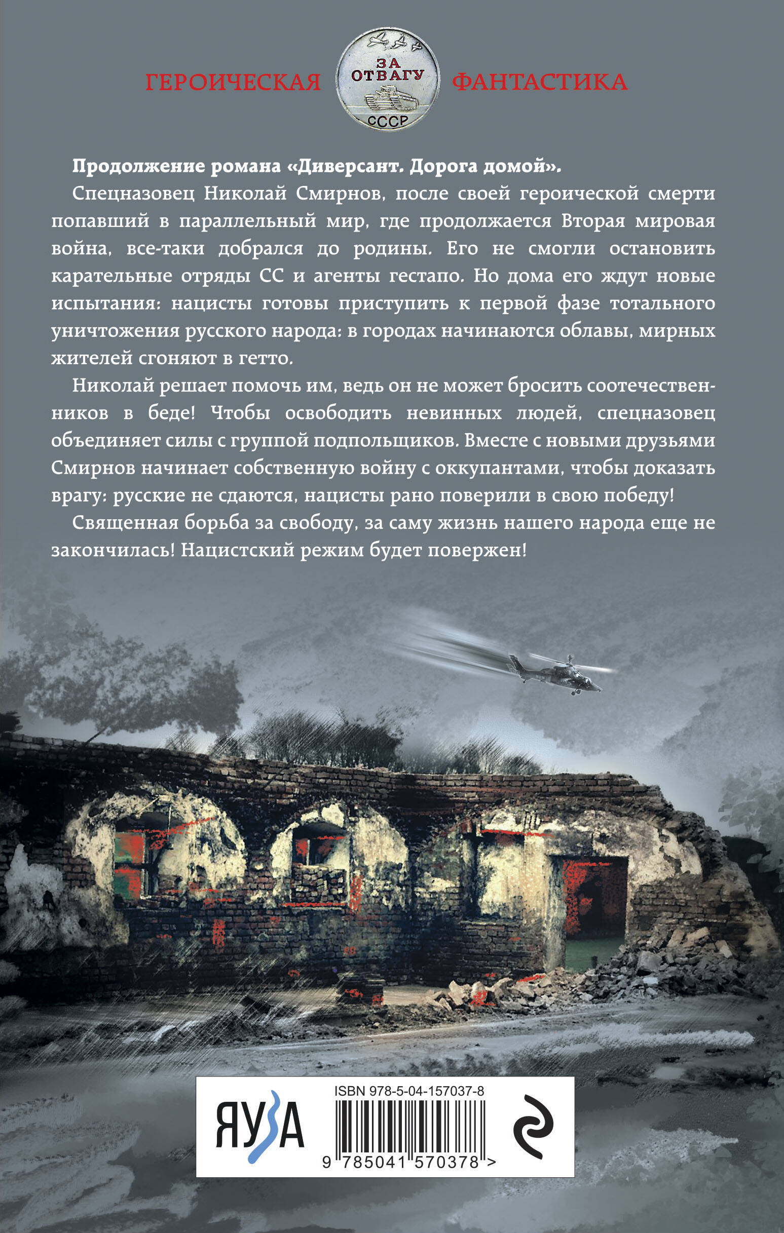 Продолжение романа «Диверсант. Дорога домой». Спецназовец Николай Смирнов, после своей героической смерти попавший в параллельный мир, где продолжается Вторая мировая война, все-таки добрался до Родины. Его не смогли остановить карательные отряды СС и агенты гестапо. Но дома его ждут новые испытания: нацисты готовы приступить к первой фазе тотального уничтожения русского народа: в городах начинаются облавы, мирных жителей сгоняют в гетто. Николай решает помочь им, ведь он не может бросить соотечественников в беде! Чтобы освободить невинных людей, спецназовец объединяет силы с группой подпольщиков. Вместе с новыми друзьями Смирнов начинает собственную войну с оккупантами, чтобы доказать врагу: русские не сдаются, нацисты рано поверили в свою победу! Священная борьба за свободу, за саму жизнь нашего народа, ещё не закончилась! Нацистский режим будет повержен!| Издательство | ООО "Издательство "Эксмо" |