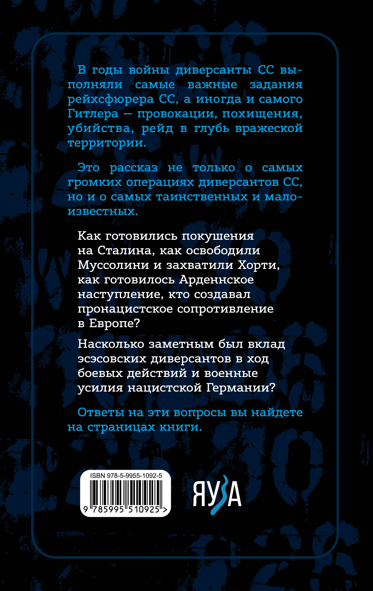 Их боялся Рузвельт и опасался Сталин… Впервые на русском языке - все операции диверсантов СС в одной книге. Охота на партизан и лидеров антигитлеровской коалиции, провокации и похищения - все это дело рук спецназа СС. В годы войны диверсанты СС выполняли самые важные задания рейхсфюрера СС, а иногда и самого Гитлера - провокации, похищения, убийства, рейд в глубь вражеской территории. Не все знают, что именно диверсанты СС в 1939 г. устроили провокацию в Глейвице, ставшую поводом к началу Второй мировой войны. Громкие операции диверсантов СС проводились не только на всех фронтах, но и там, где не было немецких частей. Диверсанты СС были экспериментальным отрядом СС, выросшим из одной роты в почти в полноценную дивизию. Немцы называли диверсантов СС истребительным соединением, а советские спецслужбы - охотничьими командами. Они успешно преследовали партизан в лесах Белоруссии, десантировались в горах Италии и Югославии, прорывались в осажденные города и вглубь боевых порядков союзных войск. В ряде случаев диверсанты СС использовали трофейную военную форму, что нарушало Женевскую конвенцию и после войны привело некоторых командиров на скамью подсудимых Это рассказ не только о самых громких операциях диверсантов СС, но и о самых таинственных и малоизвестных. Как готовились покушения на Сталина, как освободили Муссолини и захватили Хорти, как готовилось Арденнское наступление, кто создавал пронацистское сопротивление в Европе? Насколько заметным был вклад эсэсовских диверсантов в ход боевых действий и военные усилия нацистской Германии? Ответы на эти вопросы вы найдете на страницах книги.