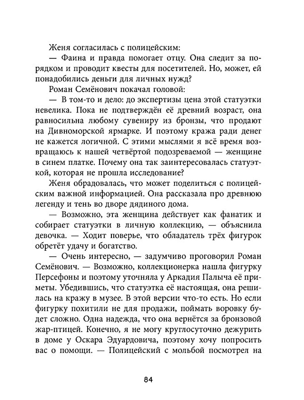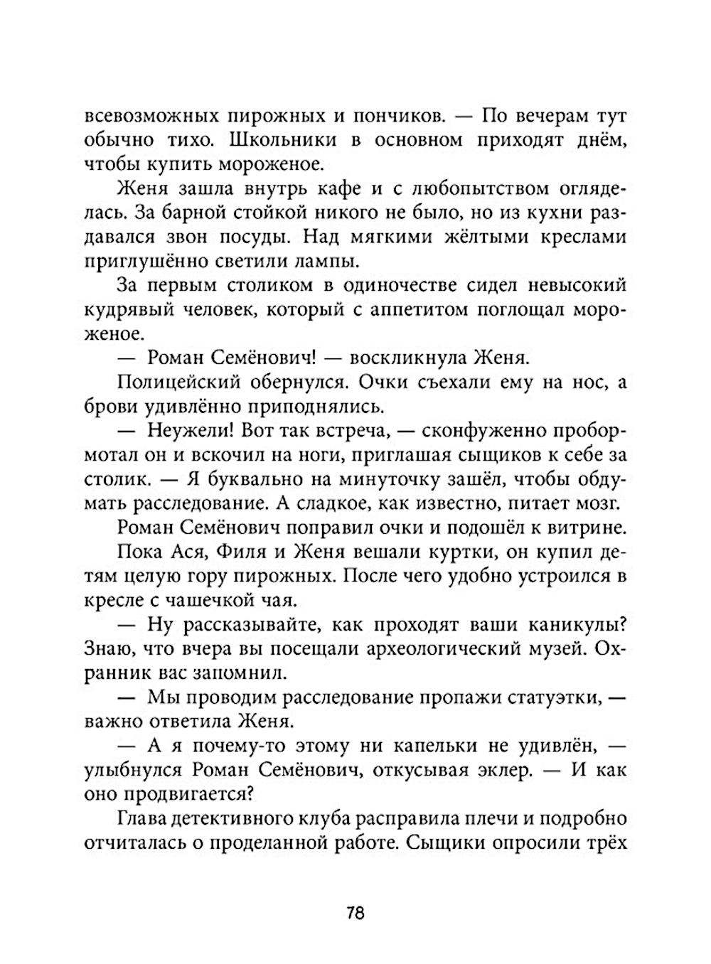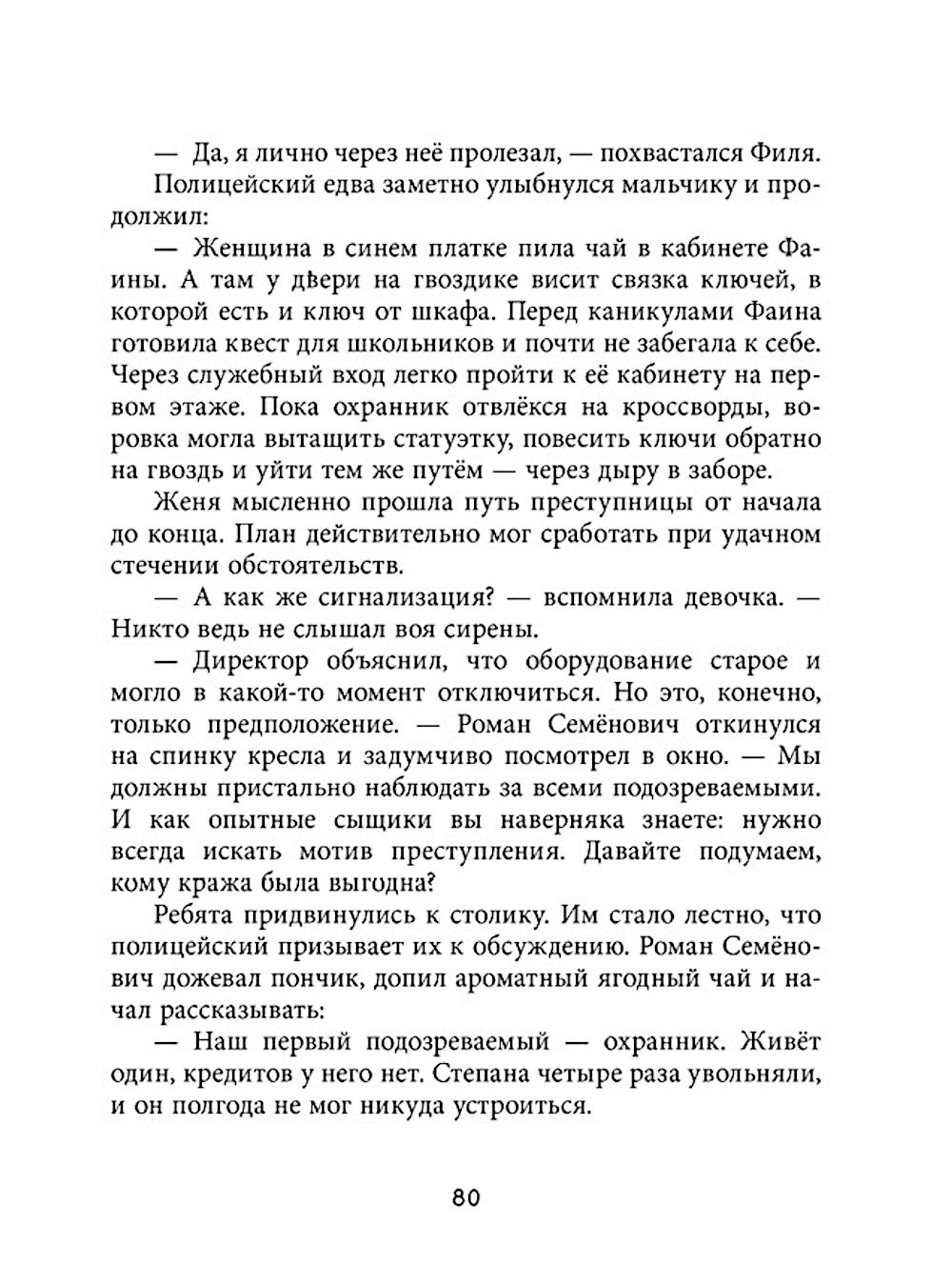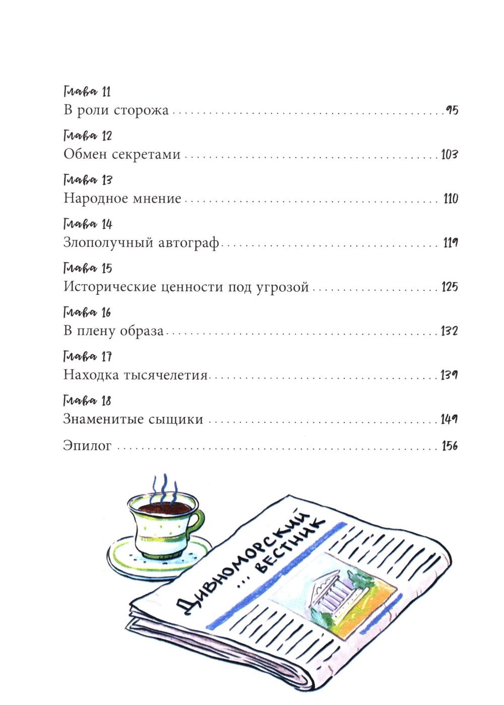 «Дивноморские сыщики. Тайна исчезнувшей статуэтки» - новое расследование Жени Остроумовой и ее друзей в курортном городке Дивноморске. Смешные иллюстрации, живые герои, загадки и захватывающий сюжет! Приехав в гости к своему дяде на премьеру спектакля, Женя Остроумова и не догадывалась, что клубу «Дивноморские сыщики» снова придется открыть свои двери! Из местного музея при загадочных обстоятельствах похищена ценная бронзовая статуэтка. Юные детективы уже в деле: есть улики и круг подозреваемых. Но преступник готов на всё, чтобы сорвать расследование. Смогут ли Женя и ее друзья противостоять давлению и докопаться до истины?