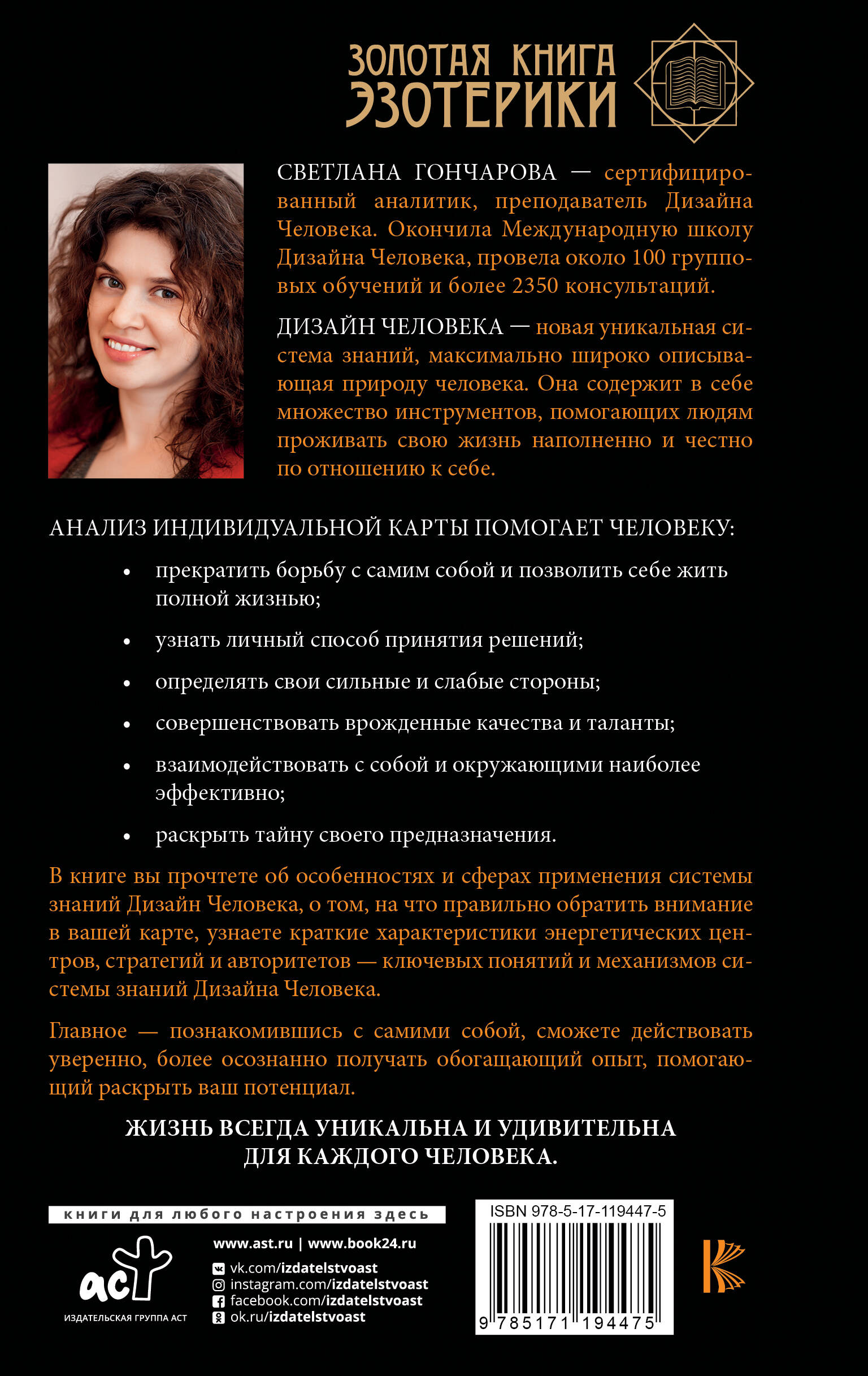 Светлана Гончарова - сертифицированный аналитик, преподаватель Дизайна Человека. Окончила Международную школу Дизайна Человека, провела около 60 групповых обучений и более 1350 консультаций. Дизайн Человека - новая уникальная система знаний, максимально широко описывающая природу человека. Она содержит в себе множество инструментов, помогающих людям проживать свою жизнь наполненно и честно по отношению к себе. Знание Дизайна Человека дает информацию о вашем личностном потенциале и рекомендации по его реализации во всех сферах жизни - от карьеры и здоровья до романтических отношений и воспитания детей. В книге вы прочтете об особенностях и сферах применения системы знаний Дизайн Человека, о том, на что правильно обратить внимание в персональной карте, узнаете краткие характеристики энергетических центров, стратегий и авторитетов - ключевых понятий и механизмов системы знания Дизайна Человека. Главное - познакомившись с самими собой, сможете действовать уверенно, более осознанно получать обогащающий опыт, помогающий раскрыть ваш потенциал.| Издательство | АСТ |