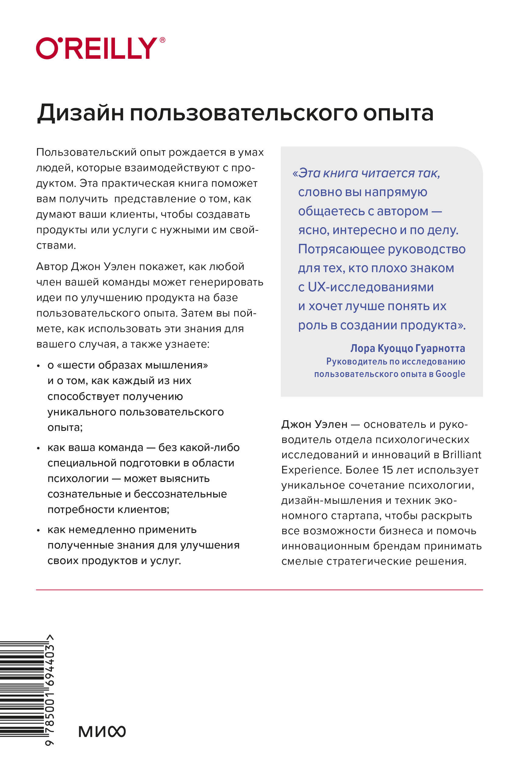 Пользовательский опыт рождается не на экране, а в умах людей, которые взаимодействуют с продуктом. Наши чувства многомерны и мультисенсорны. Эта практическая книга поможет получить представление о том, как думают клиенты, чтобы создавать продукты или услуги с нужными им свойствами. Автор Джон Уэлен покажет, как любой член вашей команды может генерировать новые идеи на базе пользовательского опыта. Затем вы поймете, как применить эти знания для ваших продуктов, а также узнаете: - о шести образах мышления и о том, как каждый из них способствует получению уникального пользовательского опыта; - как ваша команда - без какой-либо специальной подготовки в области психологии - может выяснить сознательные и бессознательные потребности ваших клиентов; - как немедленно применить полученные знания для улучшения своих продуктов и услуг. Для кого эта книга: Для владельцев бизнеса, менеджеров продукта, дизайнеров, специалистов по пользовательскому опыту и разработчиков. От автора: "Психолог разрабатывает дизайн продуктов и услуг? Как интересно..." Когда я представляюсь психологом, который разрабатывает дизайн продуктов и услуг, то чаще всего вижу на лице собеседника удивление: "Как, разве это работа не для дизайнера? Да уж, вы наверняка умеете залезть в голову потребителя! Вы анализируете меня прямо сейчас? Без комментариев!" Люди часто бывают заинтригованы, но не понимают, как знания о когнитивных процессах и эмоциях можно применить к дизайну цифровых продуктов и услуг. И это обычное дело. Задача этой книги - помочь вам понять и использовать знания о человеческой психологии, чтобы разложить пользовательский опыт на составляющие и выяснить, как сделать продукт идеальным для потребителя. И сейчас для этого самое подходящее время. Научные исследования в области когнитивной психологии стремительно развиваются: уже известно о настоящих прорывах в сфере психологии, нейробиологии, бихевиористской экономики и человеко-машинного взаимодействия, благодаря которым мы получили новые данные о функциях мозга и процессах обработки информации, формирующих пользовательский опыт.| Издательство | МАНН, ИВАНОВ И ФЕРБЕР ООО |