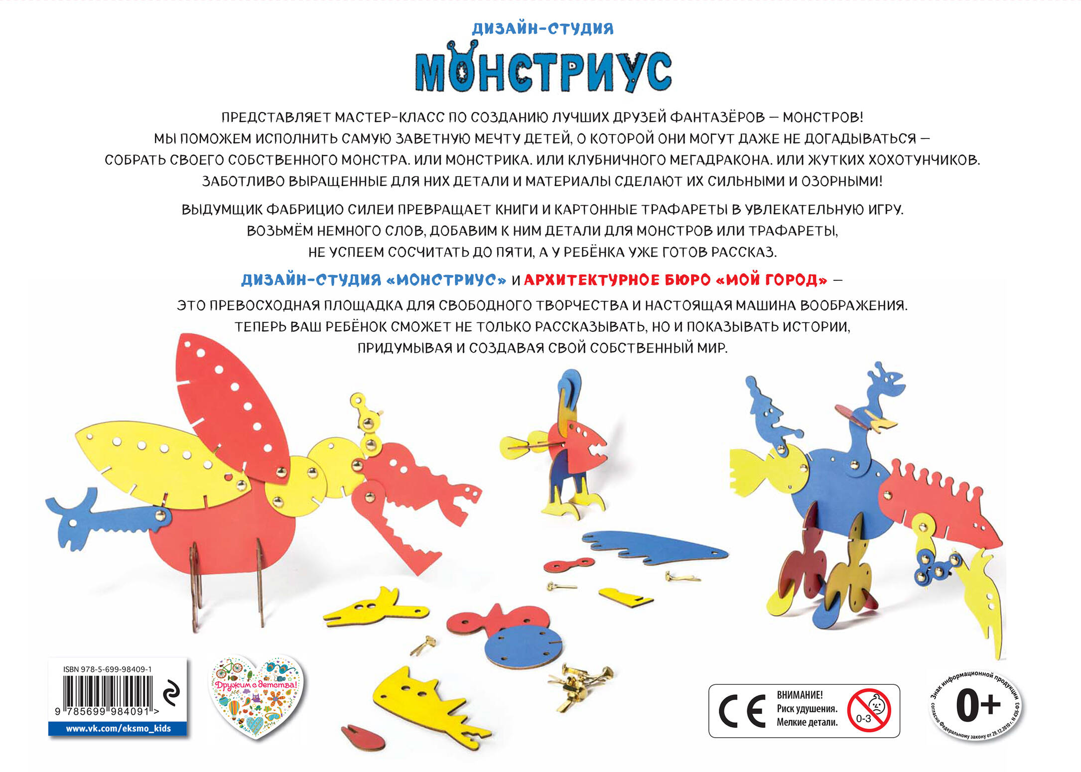 Дизайн-студия «Монстриус» - это и книга с картинками, и картонная игра, придуманная и разработанная Фабрицио Силеи. Чтобы бесконечно выдумывать и создавать симпатичных красочных монстров, вам потребуется лишь коробка недорогих брадсов разных размеров, которые можно легко найти в любом магазине канцтоваров или товаров для офиса. Монстров можно монтировать, демонтировать и переделывать сколько угодно: это практически бесконечная и всегда новая игра. Фабрицио Силеи дарит нам ещё одну книгу из серии «Придумай свой мир», в которой мир не заканчивается на последней странице, а продолжается в игре. И главный герой этой игры - маленький читатель, который отправляется в удивительное путешествие один или в сопровождении взрослого, фантазирующего вместе с ним.| Издательство | ООО "Издательство "Эксмо" |
