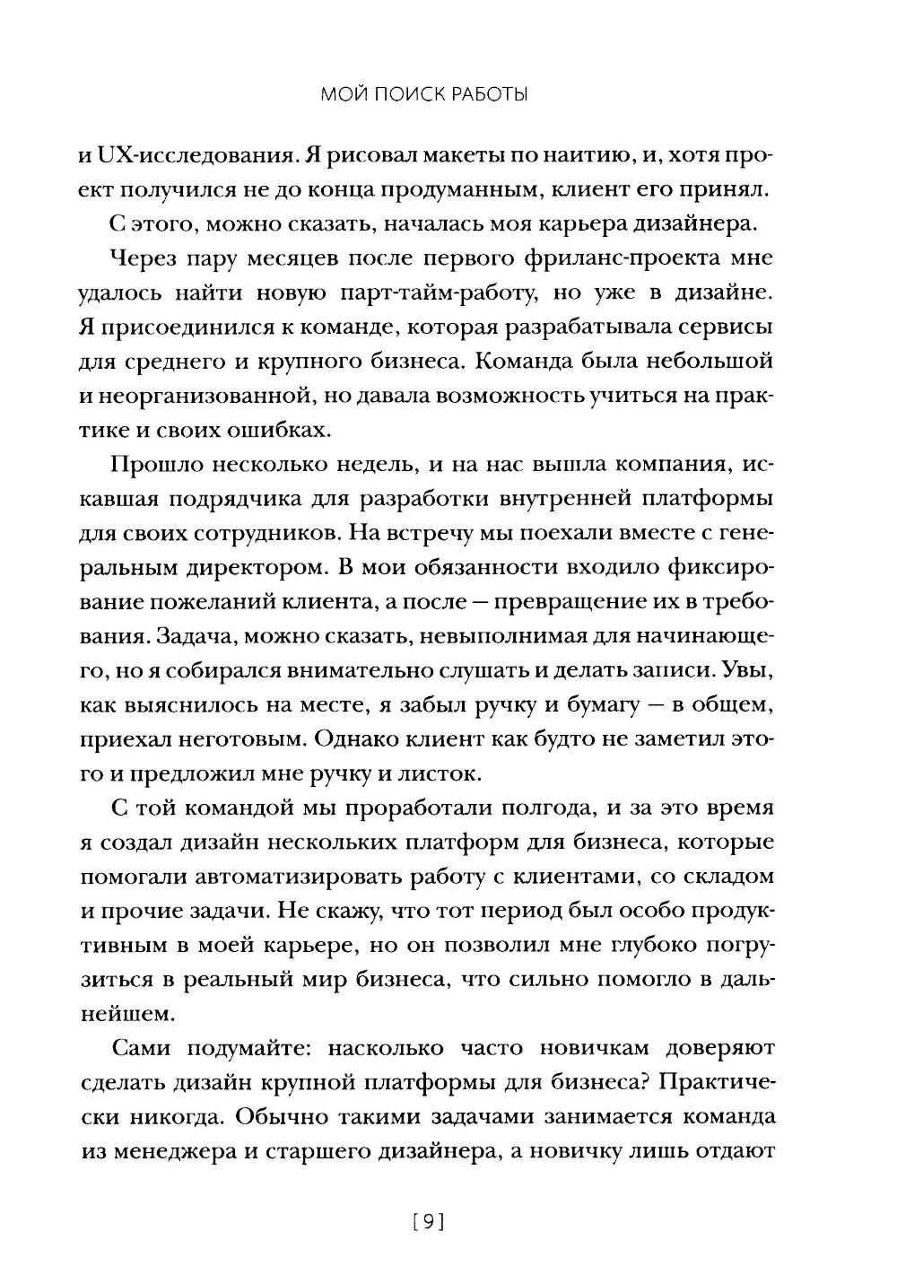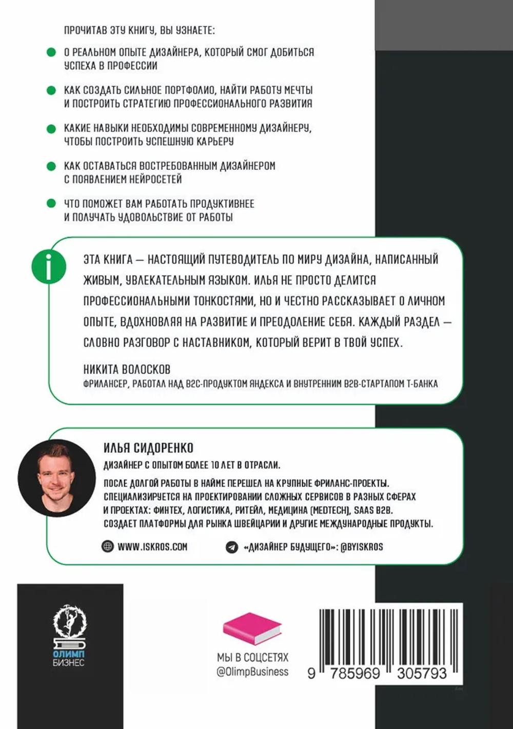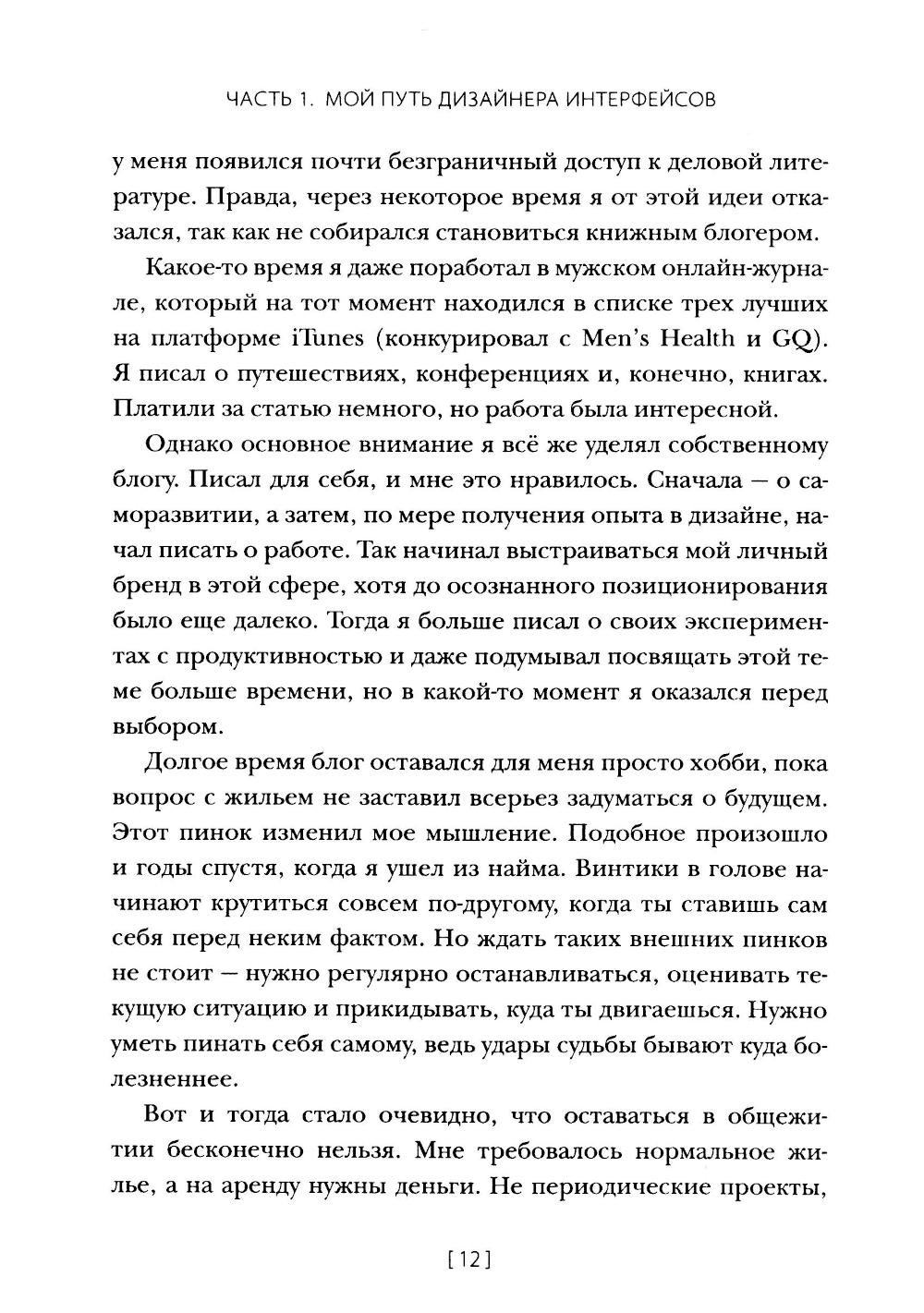 Успешный дизайнер цифровых продуктов Илья Сидоренко делится личным опытом профессионального роста. Автор приводит примеры из собственной практики и предлагает практические советы, которые помогут вам достичь впечатляющих успехов в карьере. В книге подробно раскрыты ключевые темы: создание резюме и портфолио под разные задачи; подготовка к собеседованию и выполнение тестового задания; повышение продуктивности; методы анализа аудитории и конкурентов; работа с дизайн-системами; работа над структурой проекта и отдельных экранов; проработка пользовательских сценариев; а также применение гипотез и метрик.| Издательство | Олимп-Бизнес |