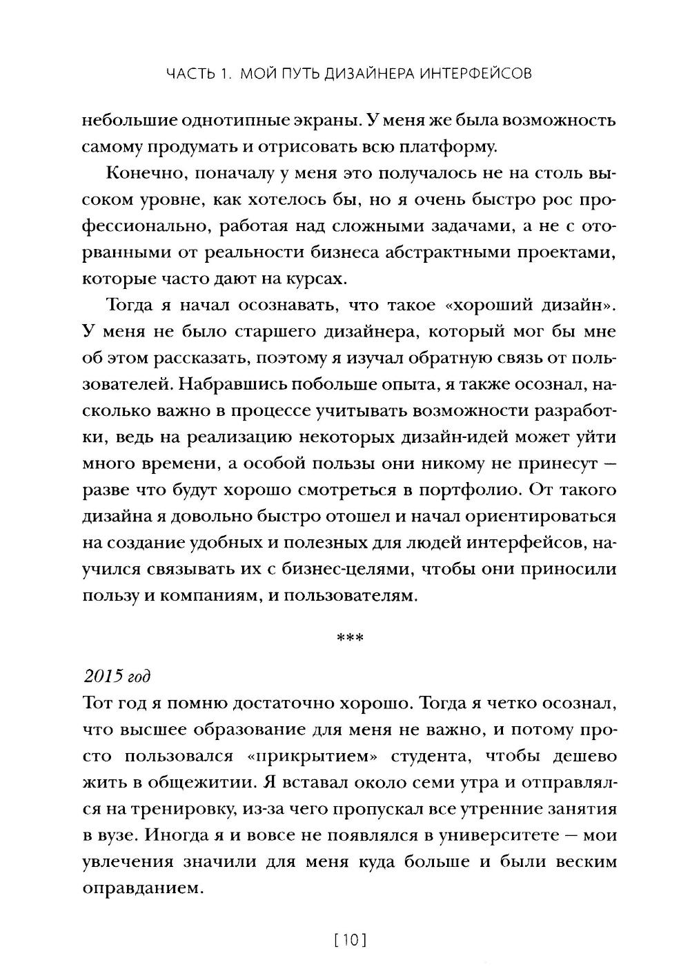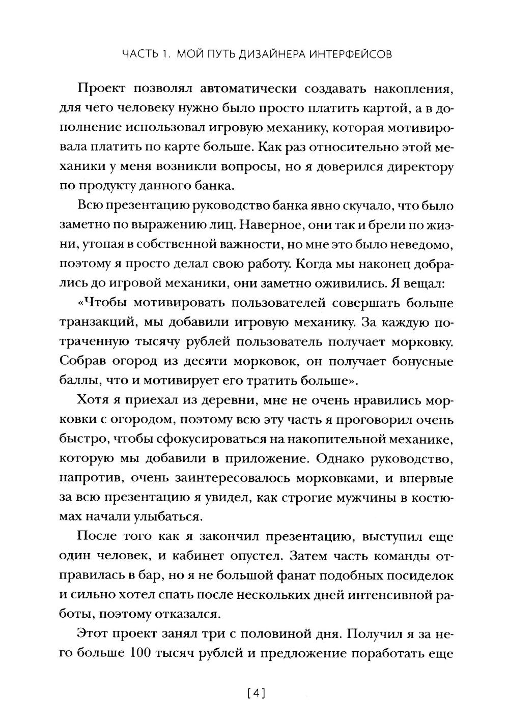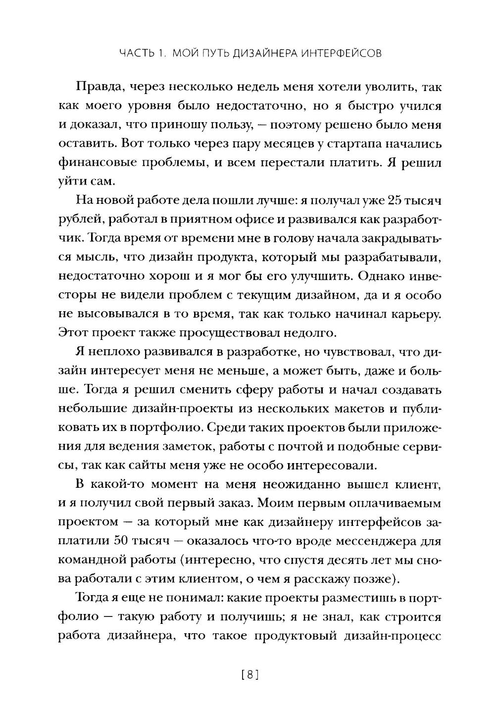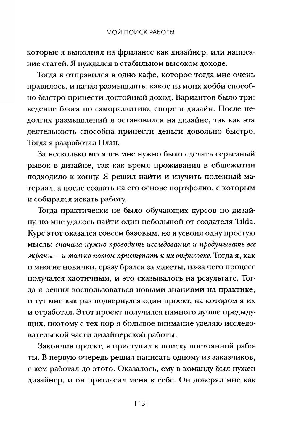 Успешный дизайнер цифровых продуктов Илья Сидоренко делится личным опытом профессионального роста. Автор приводит примеры из собственной практики и предлагает практические советы, которые помогут вам достичь впечатляющих успехов в карьере. В книге подробно раскрыты ключевые темы: создание резюме и портфолио под разные задачи; подготовка к собеседованию и выполнение тестового задания; повышение продуктивности; методы анализа аудитории и конкурентов; работа с дизайн-системами; работа над структурой проекта и отдельных экранов; проработка пользовательских сценариев; а также применение гипотез и метрик.| Издательство | Олимп-Бизнес |