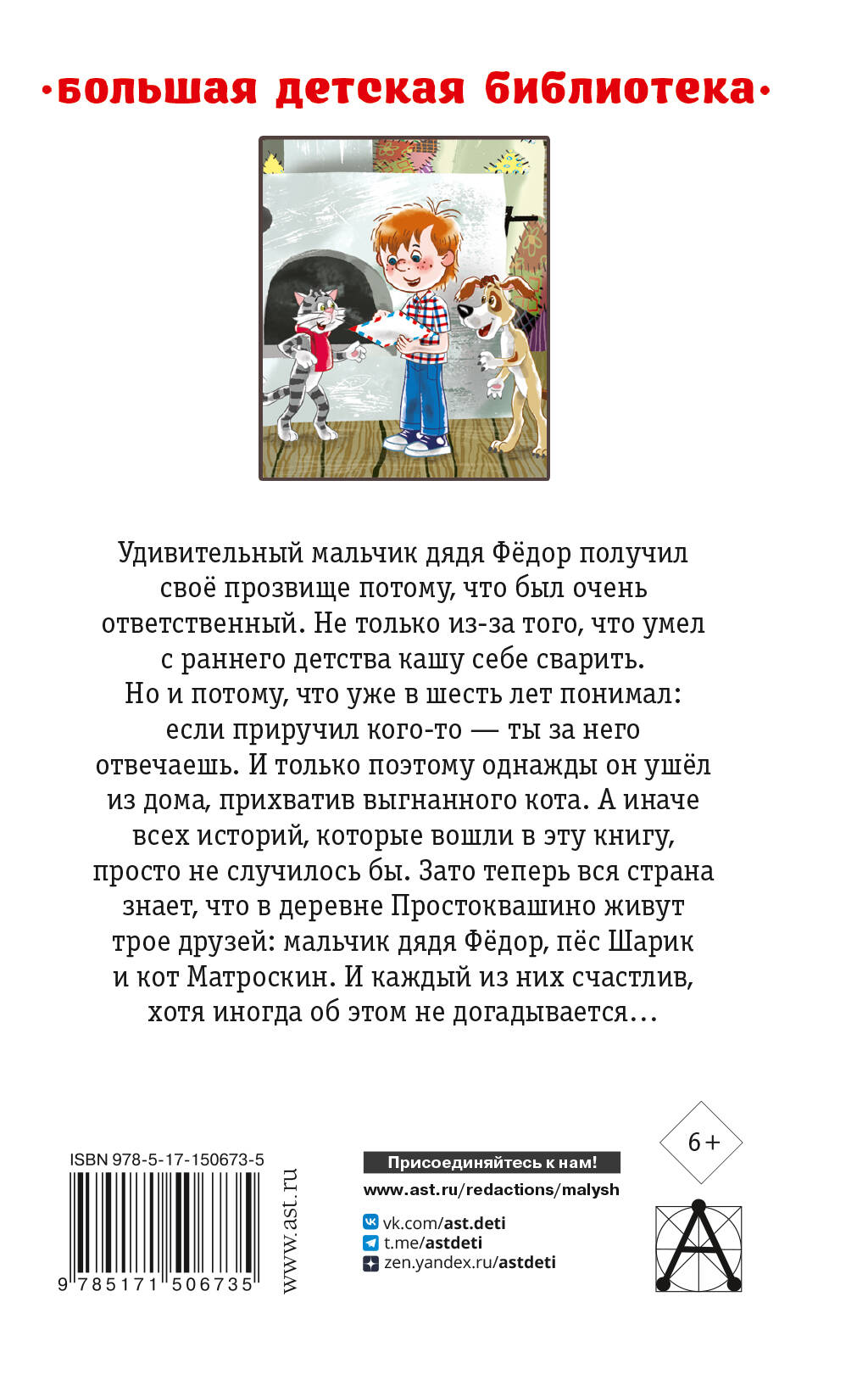 Удивительный мальчик дядя Фёдор получил своё прозвище потому, что был очень ответственный. Не только из-за того, что умел с раннего детства кашу себе сварить. Но и потому, что уже в шесть лет понимал: если приручил кого-то - ты за него отвечаешь. И только поэтому однажды он ушёл из дома, прихватив выгнанного кота. А иначе всех историй, которые вошли в эту книгу, просто не случилось бы. Зато теперь вся страна знает, что в деревне Простоквашино живут трое друзей: мальчик дядя Фёдор, пёс Шарик и кот Матроскин. И каждый из них счастлив, хотя иногда об этом не догадывается…| Издательство | АСТ |