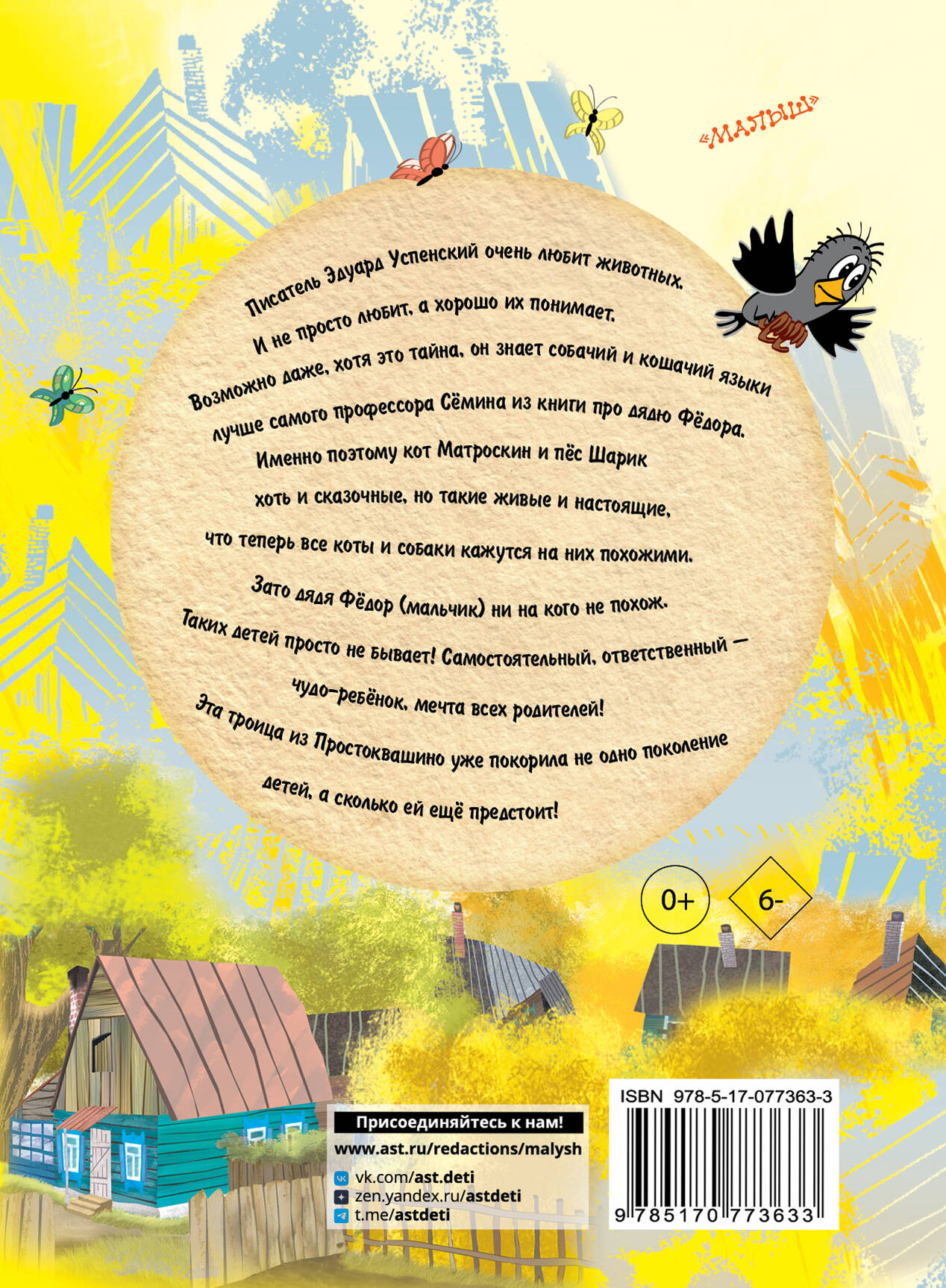 Писатель Эдуард Успенский очень любит животных. И не просто любит, а хорошо их понимает. Возможно даже, хотя это тайна, он знает собачий и кошачий языки лучше самого профессора Сёмина из книги про дядю Фёдора. Именно поэтому кот Матроскин и пёс Шарик хоть и сказочные, но такие живые и настоящие, что теперь все коты и собаки кажутся на них похожими. Зато дядя Фёдор (мальчик) ни на кого не похож. Таких детей просто не бывает! Самостоятельный, ответственный - чудо-ребёнок, мечта всех родителей! Эта троица из Простоквашино уже покорила не одно поколение детей, а сколько ей ещё предстоит!| Издательство | АСТ |