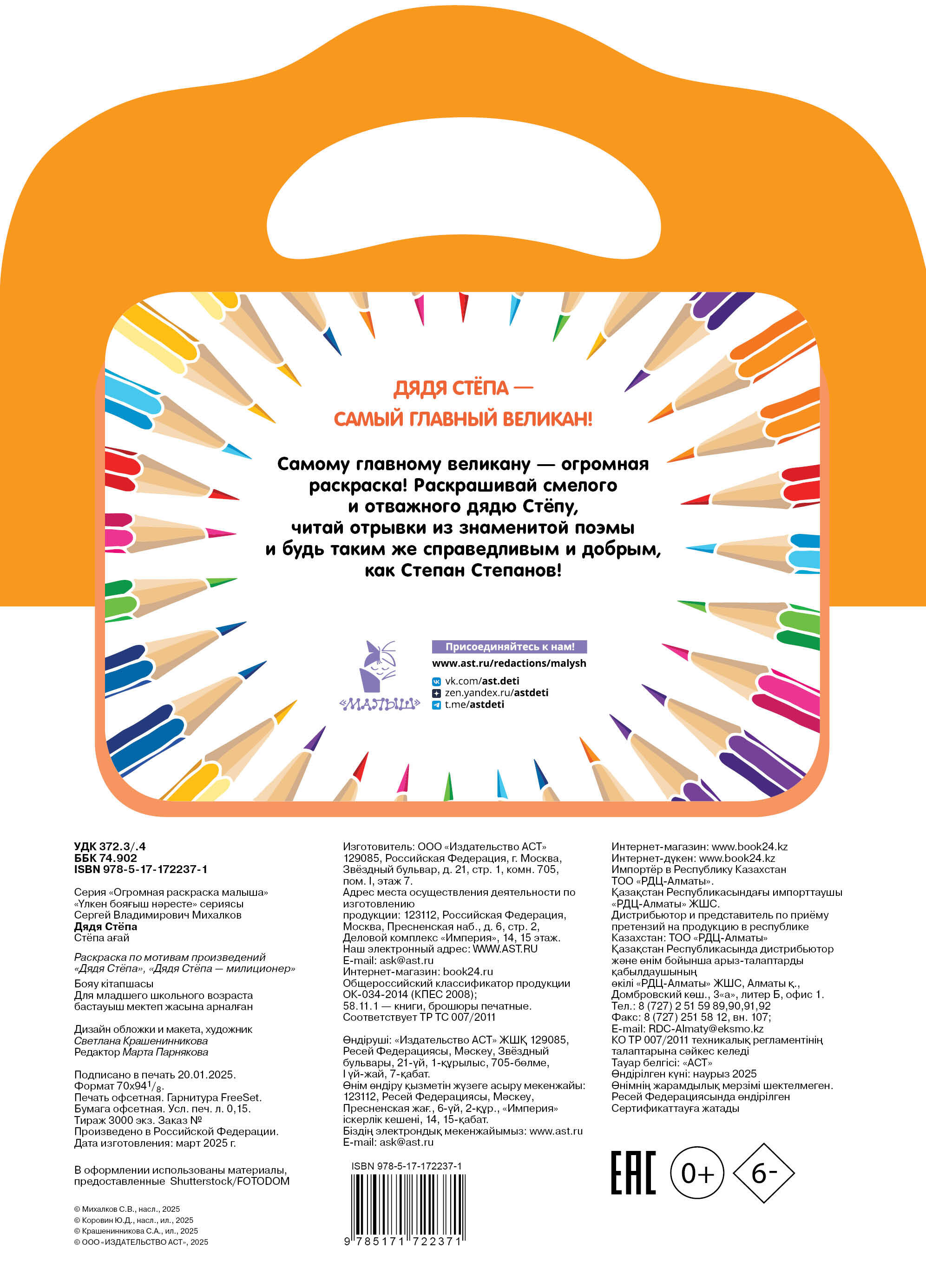 Дядя Стёпа - самый главный великан! Самому главному великану - огромная раскраска! Раскрашивай смелого и отважного дядю Стёпу, читай отрывки из знаменитой поэмы и будь таким же справедливым и добрым как Степан Степанов!| Издательство | Издательство "АСТ" |