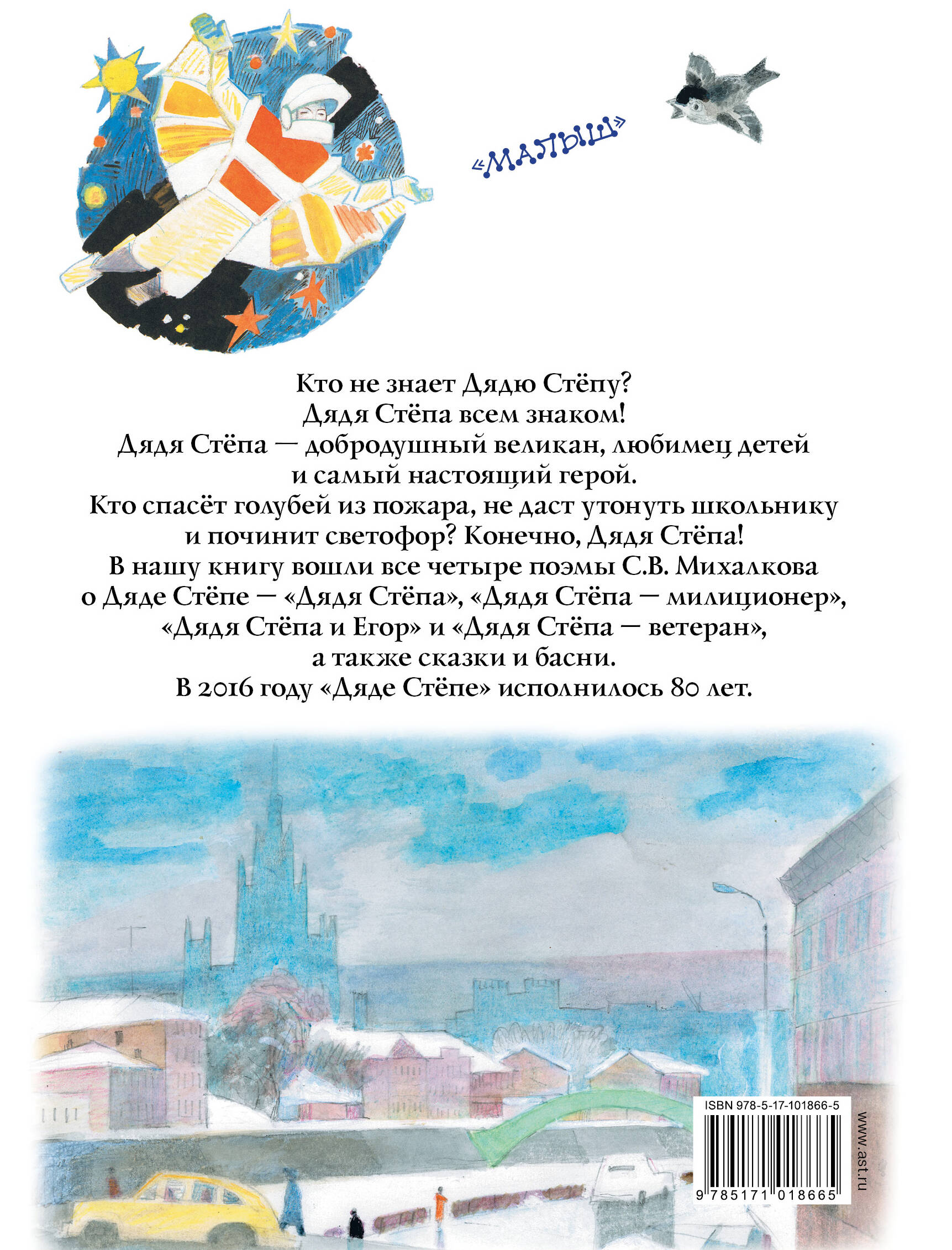 Слава С.В. Михалкова началась мгновенно с появления в 1936 году первой книги о Дяде Стёпе - справедливом, отважном и очень добром великане. «Дядя Стёпа» - одно из первых произведений Михалкова для детей. С.Я. Маршак одобрил поэму, именно с этого начался классик детской литературы Сергей Владимирович Михалков. Что интересно, автор сам похож на своего героя могучего великана Дядю Стёпу, первые иллюстраторы поэмы даже изображали её героя с лицом Сергея Михалкова. Продолжение поэмы - «Дядя Стёпа - милиционер» появилось в 1954 году. Причиной написания второй части «Дяди Стёпы» послужил реальный случай: С.В. Михалков познакомился с настоящим Дядей Стёпой, но только в милицейской форме. Прошлое милиционера было схожим с историей Дяди Стёпы, он тоже служил на флоте. Так появился «Дядя Стёпа - милиционер». Третья часть, «Дядя Стёпа и Егор», вышла в 1968-м, а отдельной книжкой - в 1969 году. Продолжение было написано по заказу детей из детского сада, об этом поэт сообщает в самом начале поэмы: Я, друзья, скажу вам сразу: Эта книжка по заказу. Я приехал в детский сад, Выступаю у ребят. - Прочитайте «Дядю Стёпу», - Хором просит первый ряд. Прочитал ребятам книжку, Не успел на место сесть, Поднимается парнишка: - А у Стёпы дети есть? Что скажу ему в ответ? Тяжело ответить: «Нет». Заключительная часть, «дядя Стёпа - ветеран», вышла в 1981 году. Все четыре части «Дяди Стёпы» проиллюстрированы заслуженным художником РСФСР Ювеналием Дмитриевичем Коровиным. Художник считал, что детская книжка - это продолжение игрушек, поэтому картинки в ней должны быть яркими и понятными. Таковы и иллюстрации к «Дяде Стёпе», малыши могут рассматривать эту книжку бесконечно. В 1939 году появился мультфильм «Дядя Стёпа» (режиссёры: В. Сутеев, Ламис Бредис), а в 1964 году «Дядя Стёпа - милиционер» (режиссер И. Аксенчук, художник Л. Шварцман). В 1967 году во МТЮЗе был поставлен музыкальные спектакль «Дядя Стёпа». В Москве, Самаре и Прокопьевске стоят памятники Дяде Стёпе. В 2016 году Дяде Стёпе исполнилось 80 лет. В книгу также вошли сказки С.В. Михалкова в стихах «Как старик корову продавал», «Три поросёнка», «Мороз и Морозец», «Упрямый лягушонок» и басни.| Издательство | Издательство "АСТ" |