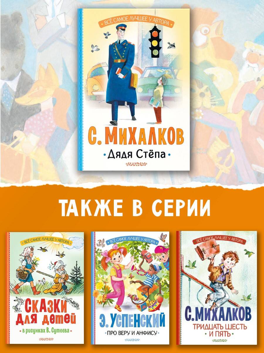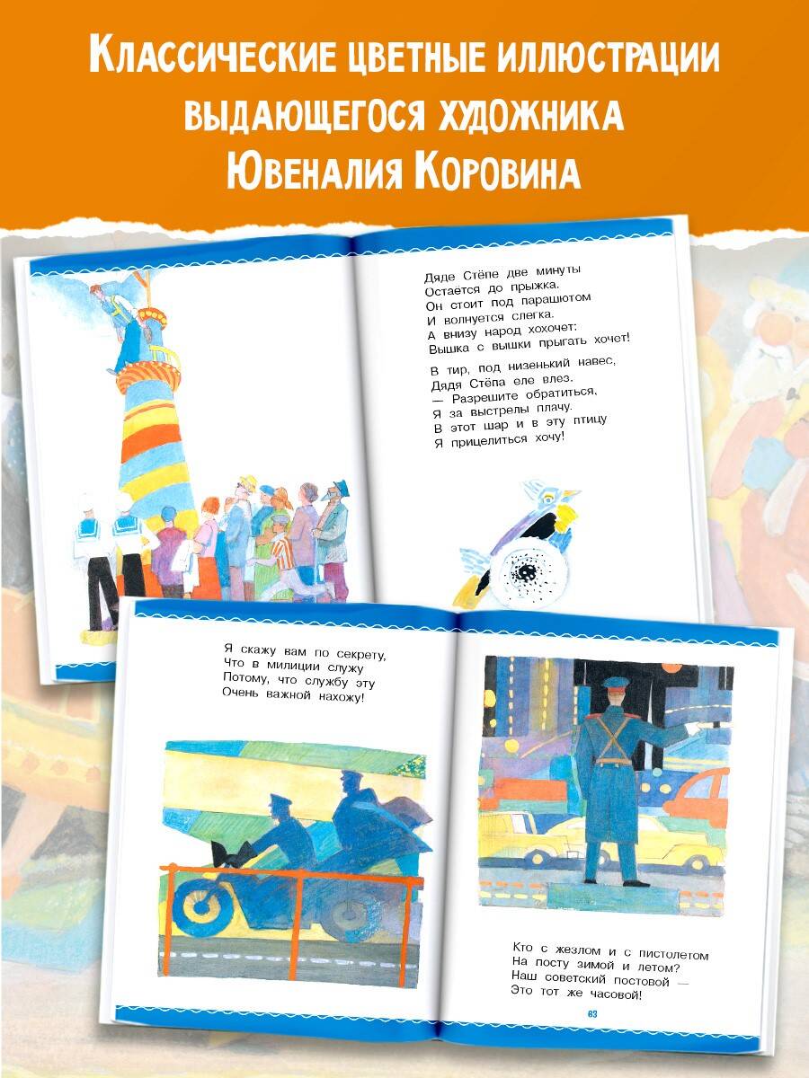 В книгу "Дядя Стёпа" С. Михалкова вошли все четыре части поэмы о знаменитом великане: "Дядя Стёпа", "Дядя Стёпа - милиционер", "Дядя Стёпа и Егор", "Дядя Стёпа - ветеран". Известнейший герой детской литературы проживает в этой книге целую жизнь: служит на флоте, работает в милиции, заботится о сыне и даже на пенсии не забывает помогать ближним. Дядя Стёпа - герой на все времена! В книге замечательные иллюстрации Ювеналия Коровина, картины которого находятся в Третьяковской галерее и других музеях России. Для дошкольного возраста.