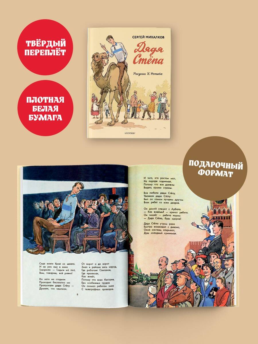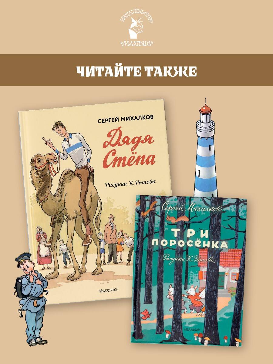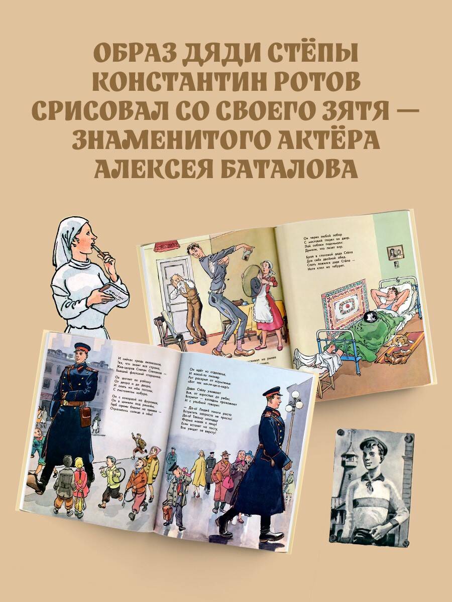 Дядя Стёпа - кто он? Степан Степанов - самый главный великан, друг детворы, защитник детей и взрослых, помощник каждому, знаменитый милиционер, старшина, спортсмен! Дядя Стёпа - герой на все времена. И он не волшебник, а обычный человек: добрый, справедливый, честный, любящий свою семью и свою страну. Таким как он может стать каждый из вас! Прочитайте знаменитую поэму Сергея Михалкова и подружитесь со Степаном Степановым. В книге уникальные иллюстрации художника-графика, карикатуриста Константина Ротова! Образ дяди Стёпы художник «срисовал» со знаменитого актёра Алексея Баталова.