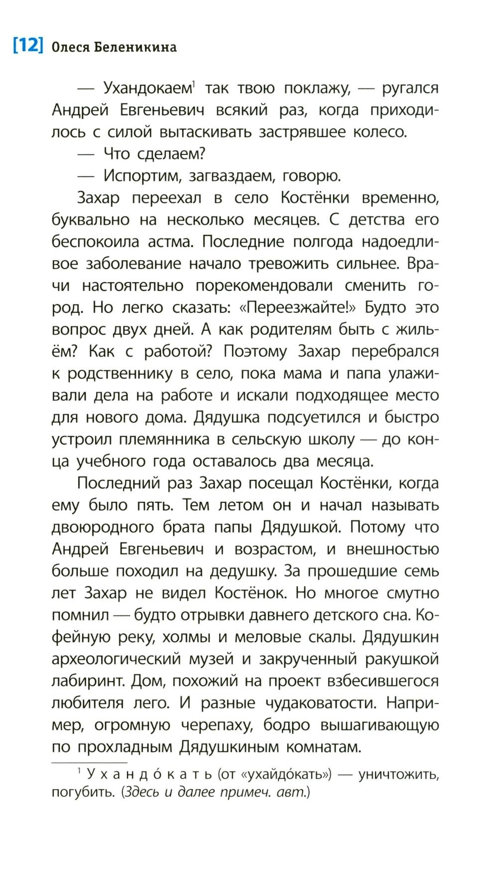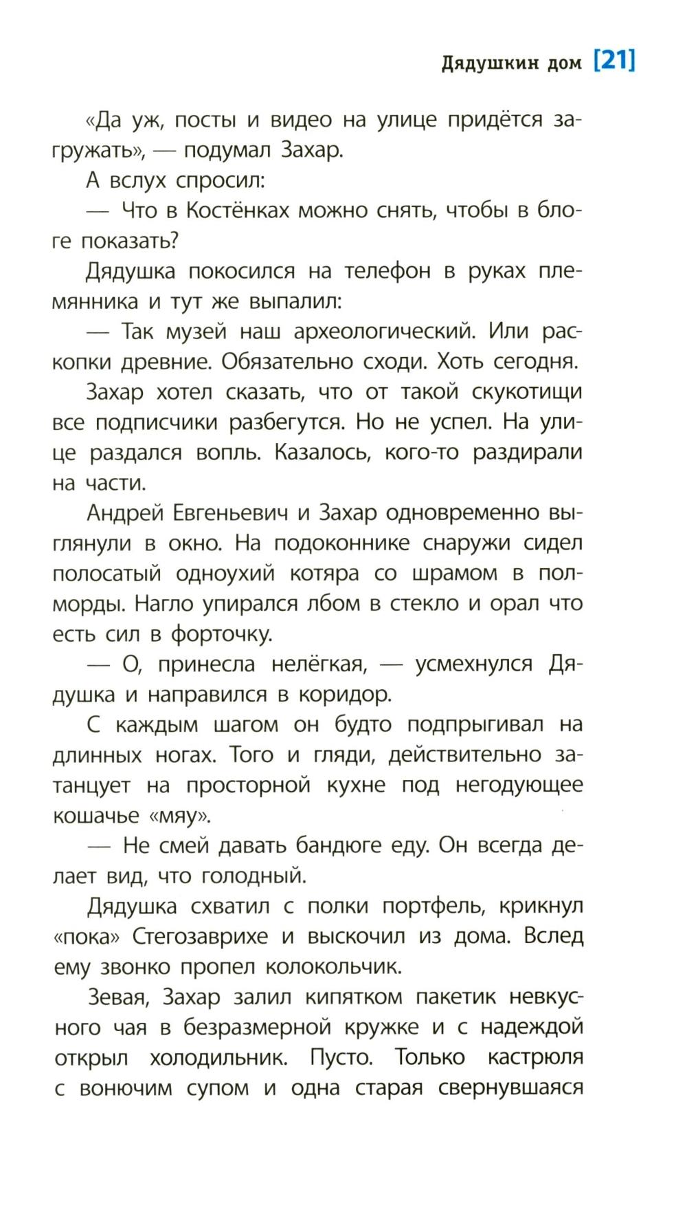 Захар временно, из-за здоровья, переехал к своему Дядушке, старшему брату папы, в село Костёнки. Мальчик здесь будет заканчивать учебный год и останется на лето. Но чем заняться в деревне? В городе у него была музыкальная группа, кружки, друзья, а здесь... Здесь странное, похожее на лего-домик жилище Дядушки, гигантская черепаха, свободно бродящая по всем комнатам, а ещё... Ещё в Костёнках есть знаменитый лабиринт времён неолита и тени, которые тот выбрасывает из прошлого в наше время. Захар встречает цыганский табор, белогвардейского офицера, опасную разбойницу Варвару, которая почему-то ненавидит всю его семью, первобытную женщину Наденьку и удивительное существо - мамонтёнка Добрыню, которого притянул из прошлого он сам, Захар! Невероятно, но у Захара есть дар, которому никто в селе особо не удивляется: он может дотрагиваться до теней. Кроме него, на такое никто не способен! И всё бы хорошо, но лабиринт на краю Костёнок и музей, в котором работает Дядушка, хотят снести и построить на их месте коттеджный поселок! Можно ли противостоять инвесторам, когда тебя поддерживают только тени лабиринта и одноклассники? Получится ли у ребят помочь мамонтёнку вернуться в своё время? И почему разбойница Варвара так хочет отомстить Захару и его семье, а ещё сможет ли она снова обрести плоть и перестать быть лишь тенью лабиринта?| Издательство | Детская литература |