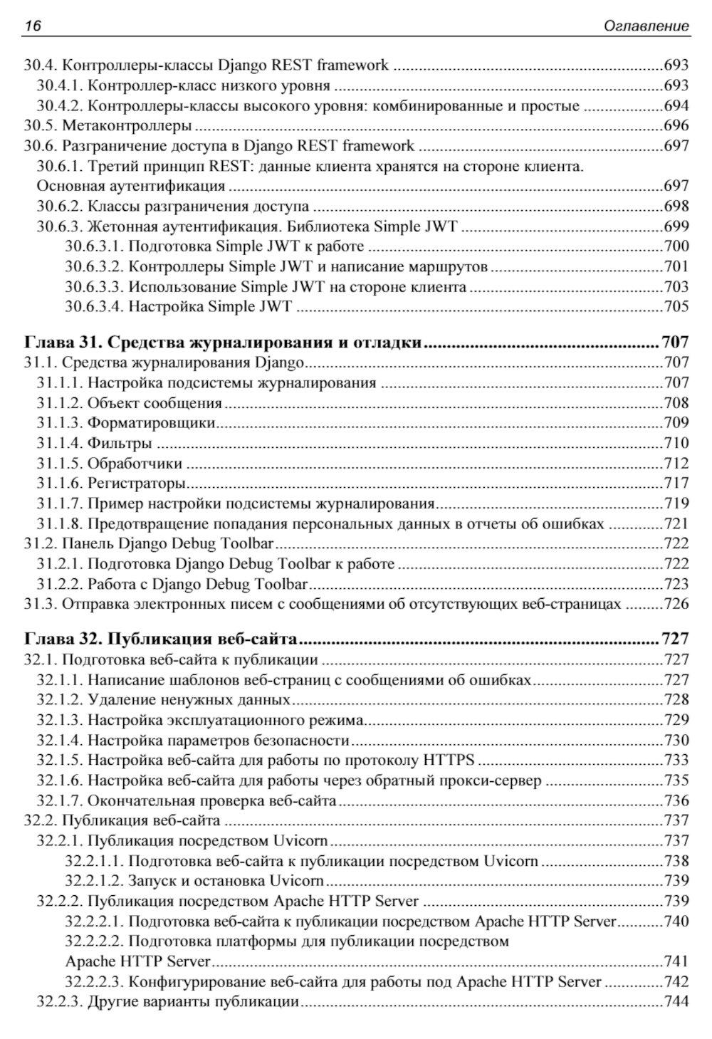 Книга посвящена разработке веб-сайтов на языке Python с применением веб-фреймворка Django 5.1. Представлены новинки Django и дано наиболее полное описание его инструментов и средств: моделей, миграций, контролеров, шаблонов, обработки пользовательского ввода, разграничения доступа, посредников, сигналов, отправки электронной почты, локализации, кеширования, работы с базами данных PostgreSQL, поддержке нескольких веб-сайтов, простых страниц, статичных перенаправлений, жетонной аутентификации и др. Описаны полезные дополнительные библиотеки, реализующие обработку BBCode, CAPTCHA, вывод графических миниатюр, интеграцию с Bootstrap. Рассказано о программировании веб-служб REST, настройке встроенного административного веб-сайта и публикации готового сайта посредством веб-серверов Uvicorn и Apache HTTP Server. Подробно описано создание полнофункционального веб-сайта - электронной доски объявлений. Электронное приложение-архив на сайте издательства содержит коды всех примеров.| Издательство | BHV(БХВ) |