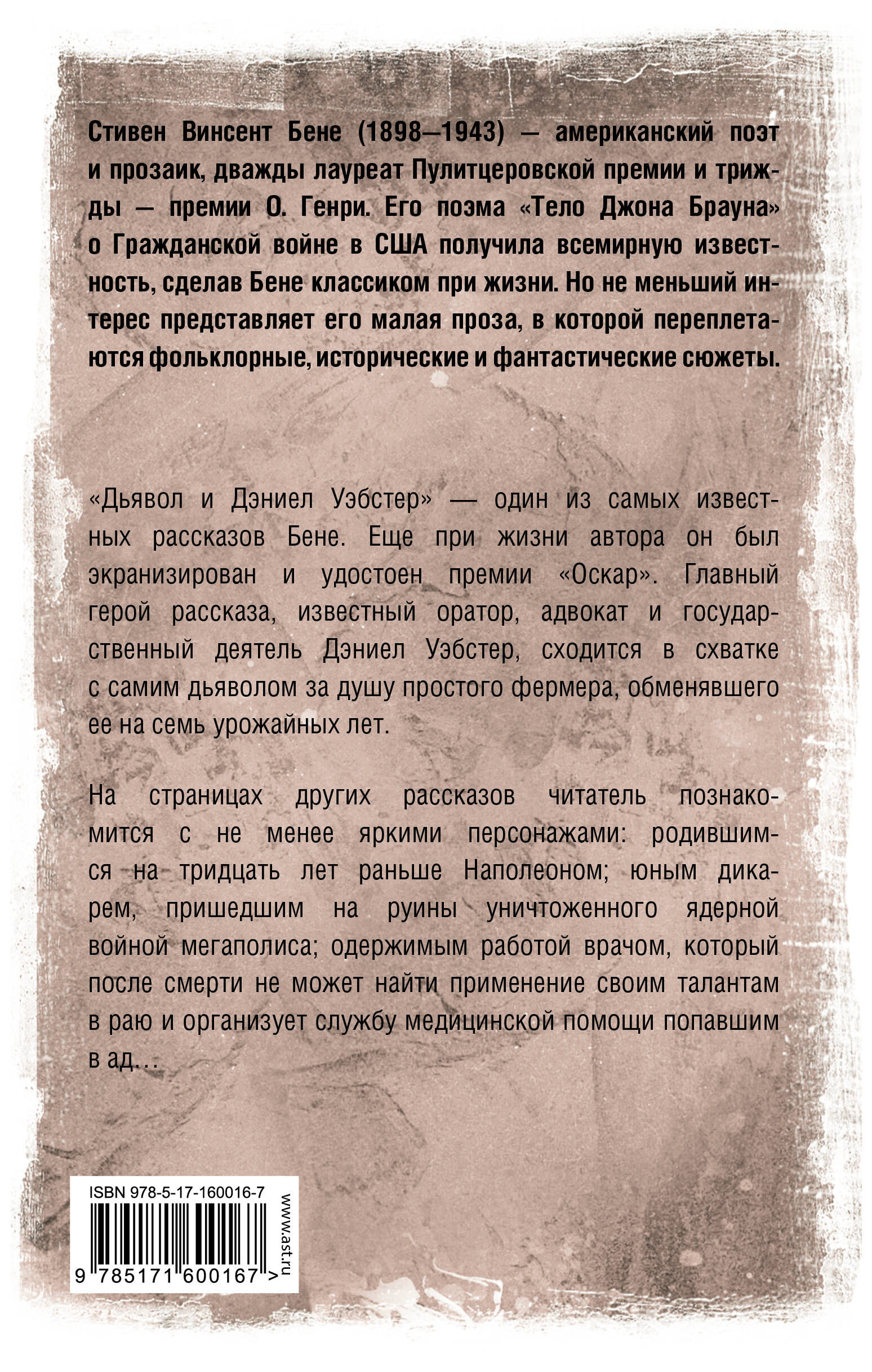 "Дьявол и Дэниел Уэбстер" - один из самых известных рассказов Бене. Еще при жизни автора он был экранизирован и удостоен премии "Оскар". Главный герой рассказа, известный оратор, адвокат и государственный деятель Дэниел Уэбстер, сходится в схватке с самим дьяволом за душу простого фермера, обменявшего ее на семь урожайных лет. На страницах других рассказов читатель познакомится с не менее яркими персонажами: родившимся на тридцать лет раньше Наполеоном; юным дикарем, пришедшим на руины уничтоженного ядерной войной мегаполиса; одержимым работой врачом, который после смерти не может найти применение своим талантам в раю и организует службу медицинской помощи попавшим в ад…| Издательство | Издательство "АСТ" |