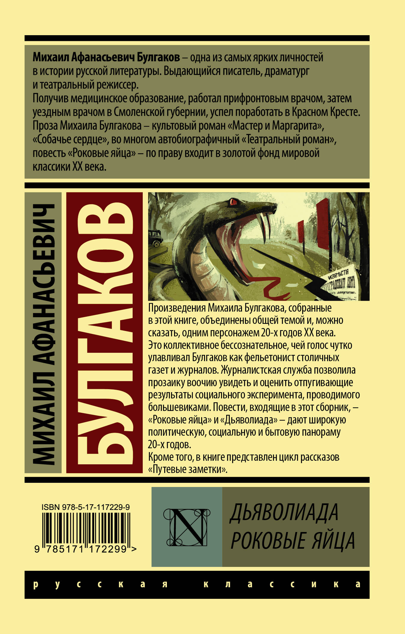 Произведения Михаила Булгакова, собранные в этой книге, объединены общей темой и, можно сказать, одним персонажем 20-х годов ХХ века. Это коллективное бессознательное, чей голос чутко улавливал Булгаков как фельетонист столичных газет и журналов. Журналистская служба позволила прозаику воочию увидеть и оценить отпугивающие результаты социального эксперимента, проводимого большевиками. Повести, входящие в этот сборник - "Роковые яйца" и "Дьяволиада", - дают широкую политическую, социальную и бытовую панораму 20-х годов. Кроме того, в книге представлен цикл рассказов "Путевые заметки".