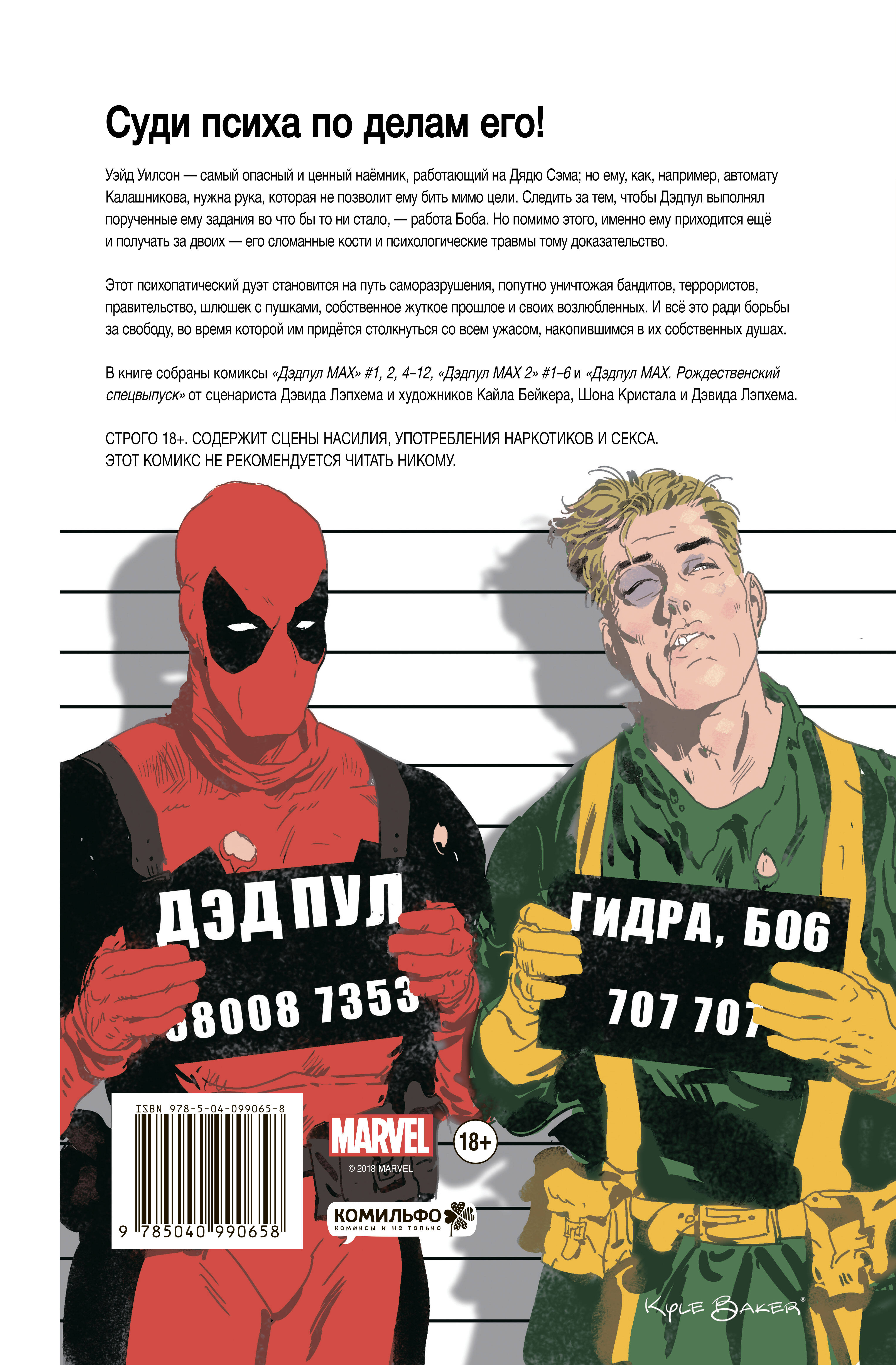 Суди психа по делам его! Уэйд Уилсон - самый опасный и ценный наёмник, работающий на Дядю Сэма; но ему, как, например, автомату Калашникова, нужна рука, которая не позволит ему бить мимо цели. Следить за тем, чтобы Дэдпул выполнял порученные ему задания во что бы то ни стало, - работа Боба. Но помимо этого, именно ему приходится ещё и получать за двоих - его сломанные кости и психологические травмы тому доказательство. Этот психопатический дуэт становится на путь саморазрушения, попутно уничтожая бандитов, террористов, правительство, шлюшек с пушками, собственное жуткое прошлое и своих возлюбленных. И всё это ради борьбы за свободу, во время которой им придётся столкнуться со всем ужасом, накопившимся в их собственных душах. В книге собраны комиксы "Дэдпул MAX" #1, 2, 4-12, "Дэдпул MAX 2" #1-6 и "Дэдпул MAX. Рождественский спецвыпуск" от сценариста Дэвида Лэпхема и художников Кайла Бейкера, Шона Кристала и Дэвида Лэпхема.| Издательство | ООО "Издательство "Эксмо" |