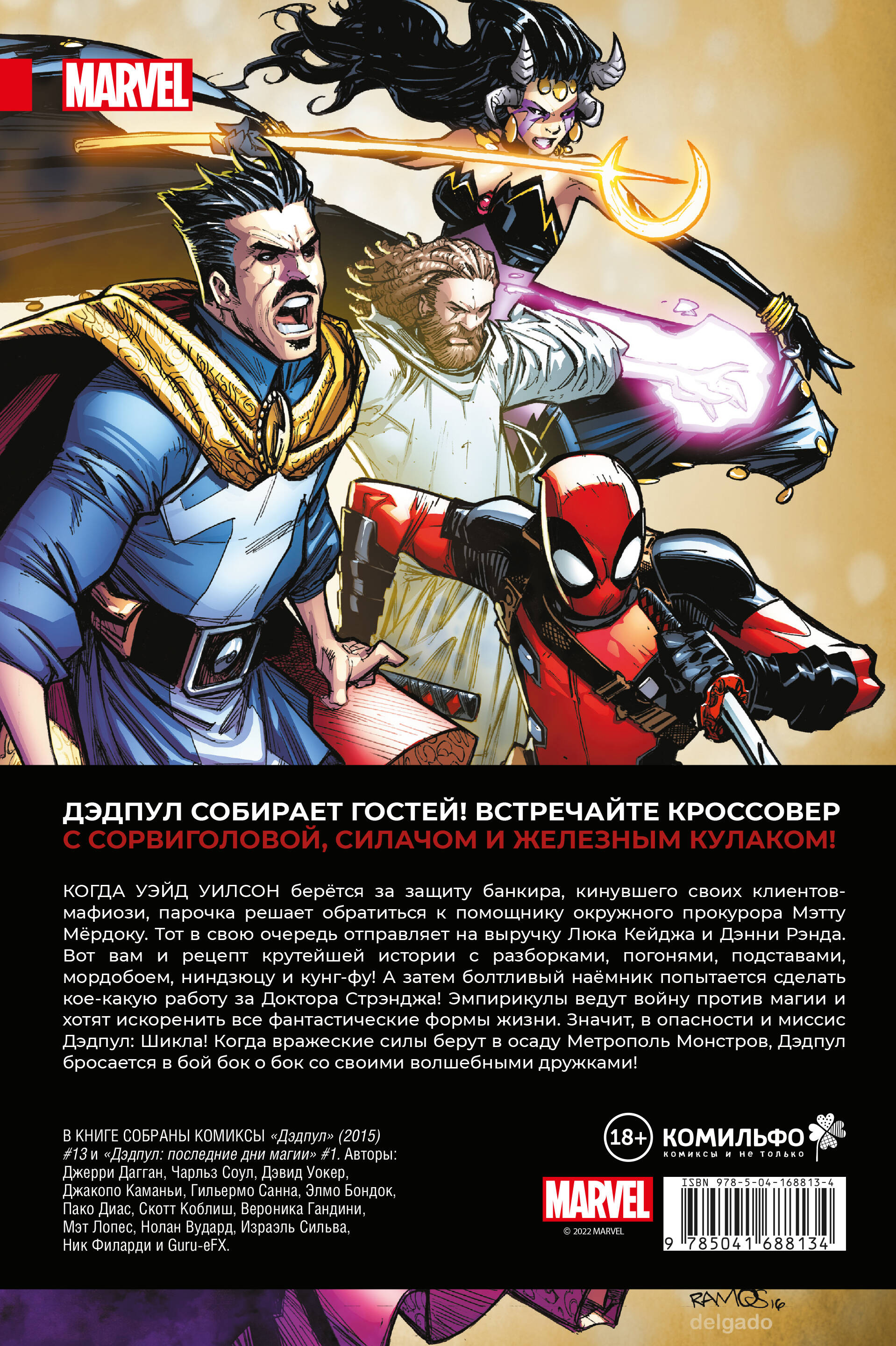 Дэдпул собирает гостей! Встречайте кроссовер с Сорвиголовой, Силачом И Железным Кулаком! Когда Уэйд Уилсон берётся за защиту банкира, кинувшего своих клиентов-мафиози, парочка решает обратиться к помощнику окружного прокурора Мэтту Мёрдоку. Тот в свою очередь отправляет на выручку Люка Кейджа и Дэнни Рэнда. Вот вам и рецепт крутейшей истории с разборками, погонями, подставами, мордобоем, ниндзюцу и кунг-фу! А затем болтливый наёмник попытается сделать кое-какую работу за Доктора Стрэнджа! Эмпирикулы ведут войну против магии и хотят искоренить все фантастические формы жизни. Значит, в опасности и миссис Дэдпул: Шикла! Когда вражеские силы берут в осаду Метрополь Монстров, Дэдпул бросается в бой бок о бок со своими волшебными дружками! В книге собраны комиксы «Дэдпул» (2015) #13 и «Дэдпул: последние дни магии» #1. Авторы: Джерри Дагган, Чарльз Соул, Дэвид Уокер, Джакопо Каманьи, Гильермо Санна, Элмо Бондок, Пако Диас, Скотт Коблиш, Вероника Гандини, Мэт Лопес, Нолан Вудард, Израэль Сильва, Ник Филарди и Guru-eFX.| Издательство | ООО "Издательство "Эксмо" |