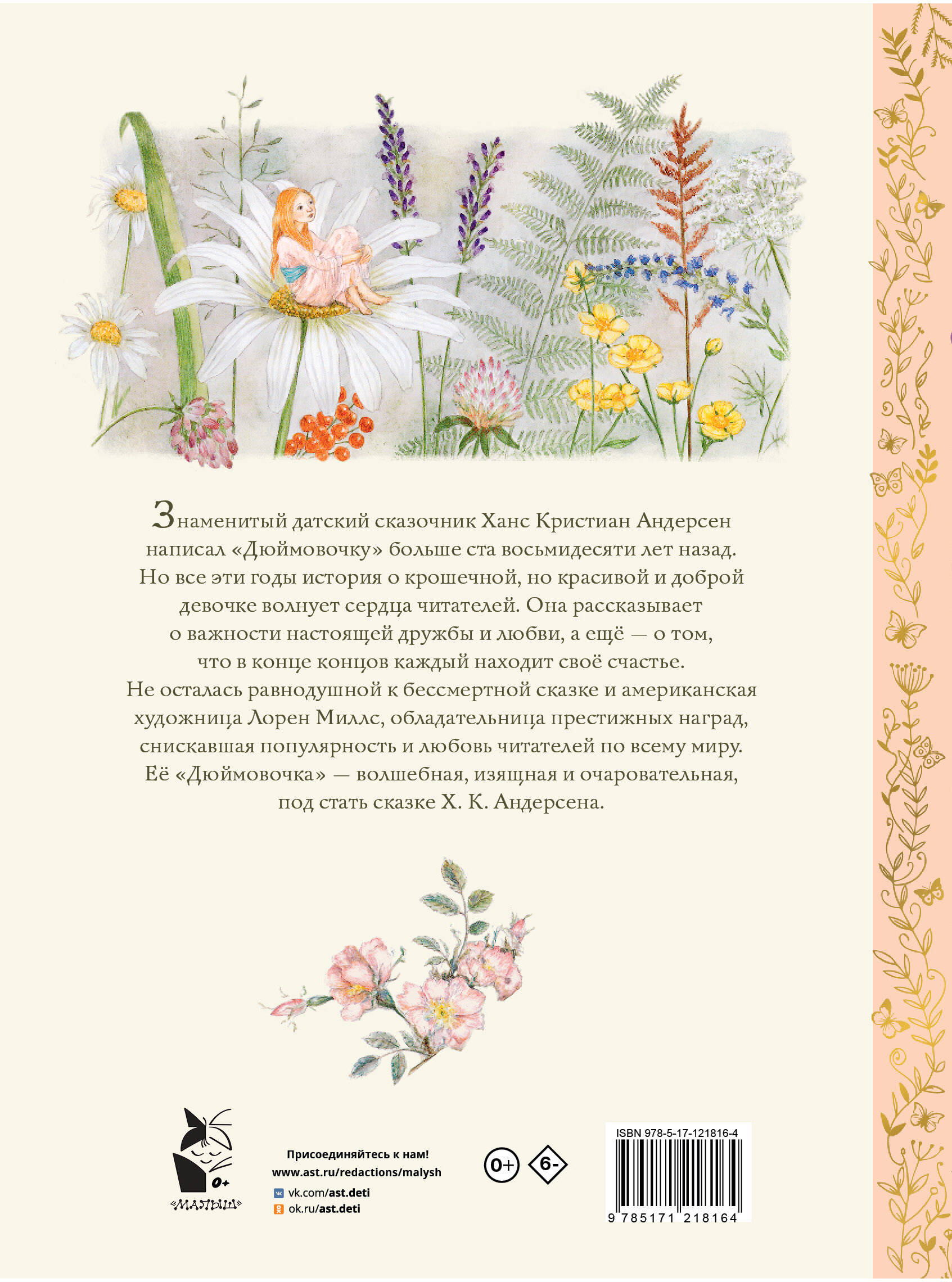 Знаменитый датский сказочник Ханс Кристиан Андерсен написал свою "Дюймовочку" больше ста восьмидесяти лет назад. Но все эти годы история о крошечной, но красивой и доброй девочке волнует сердца читателей. Она рассказывает о важности настоящей дружбы и любви, а ещё - о том, что в конце концов каждый находит своё счастье. Не осталась равнодушной к бессмертной сказке и американская художница Лорен Миллс, обладательница различных престижных наград, снискавшая популярность и любовь читателей по всему миру. Ее "Дюймовочка" - волшебная, изящная и очаровательная, под стать сказке Андерсена.| Издательство | АСТ |