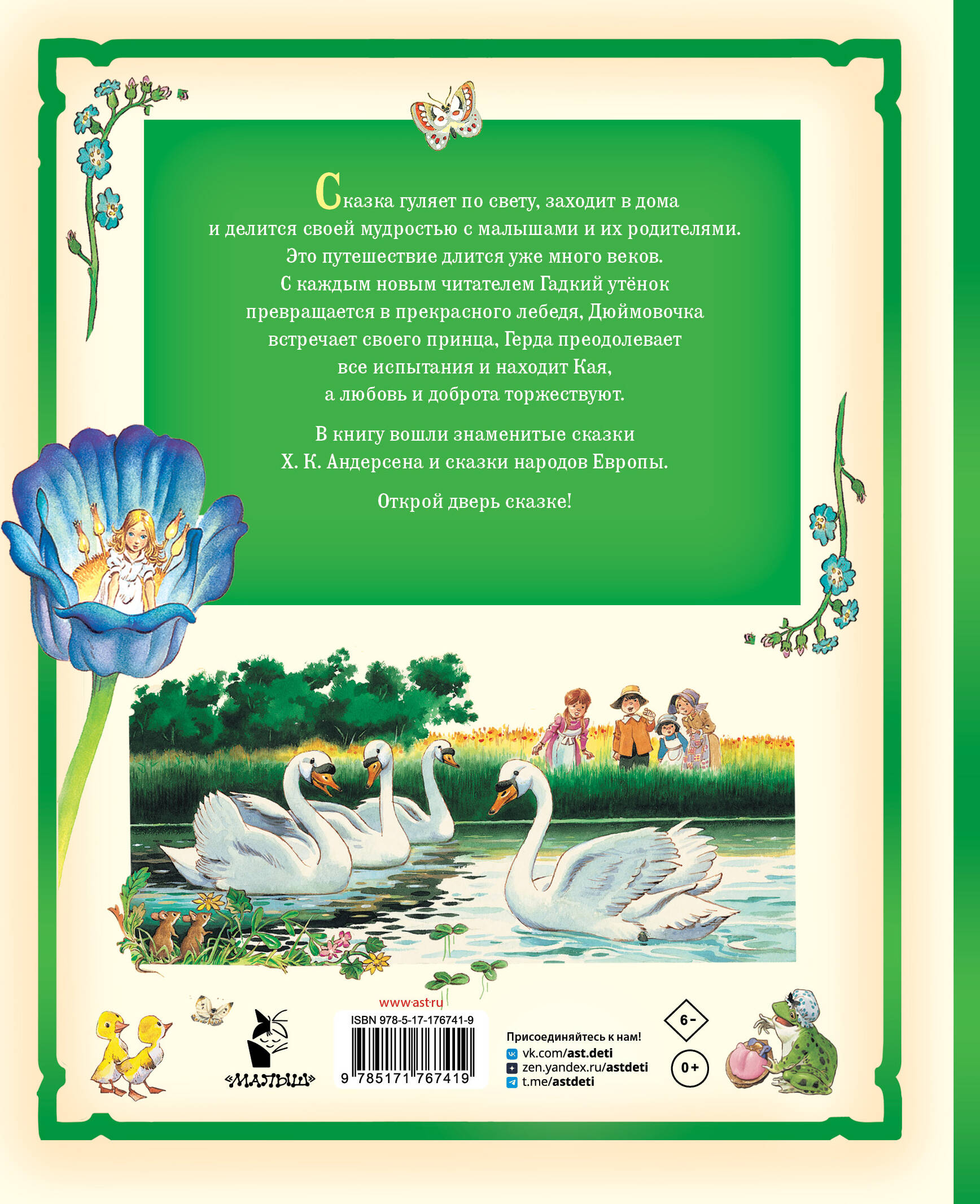 Сказка гуляет по свету, заходит в дома и делится своей мудростью с малышами и их родителями. Это путешествие длится уже много веков. С каждым новым читателем Гадкий утёнок превращается в прекрасного лебедя, Дюймовочка встречает своего принца, Герда преодолевает все испытания и находит Кая, а любовь и доброта торжествуют. В книгу вошли знаменитые сказки Х. К. Андерсена и сказки народов Европы. Открой дверь сказке!| Издательство | Издательство "АСТ" |