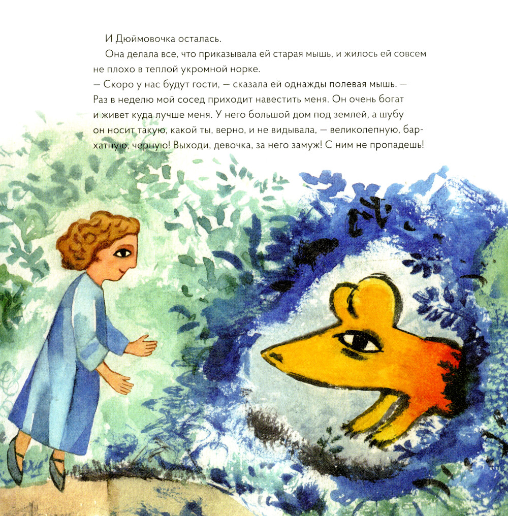 Новая серия издательства VoiceBook - любимые сказки, проиллюстрированные в манере письма известных художников. Нежная и аллегорическая история о девочке размером с наперсток сопровождается фантасмагорическими и воздушными рисунками в манере Марка Шагала. Наивное и окрыленное творчество великого белорусского художника стало источником вдохновения для иллюстратора, чтобы рассказать историю странствий крошечной Дюймовочки, поведать о ее добром сердце и о маленьком сказочном мире. Листая страницы книги, ребенок может познакомиться с направлением авангардистской живописи и открыть для себя Марка Шагала. Новую серию книг издательства можно читать или рассматривать, можно сравнивать иллюстрации с изображениями оригинальных работ великих мастеров, искать повторяющиеся детали, обсуждать отличия в композициях и сюжетах, цветовую палитру и особенности эпохи. Для этого достаточно взять в руки книгу и погрузиться в ее сказочно-художественный мир.| Издательство | VoiceBook |