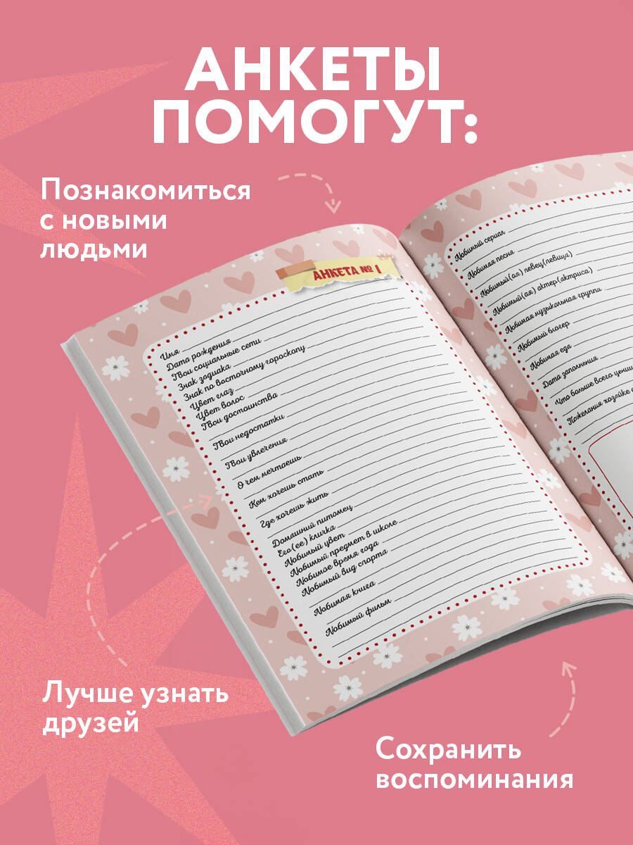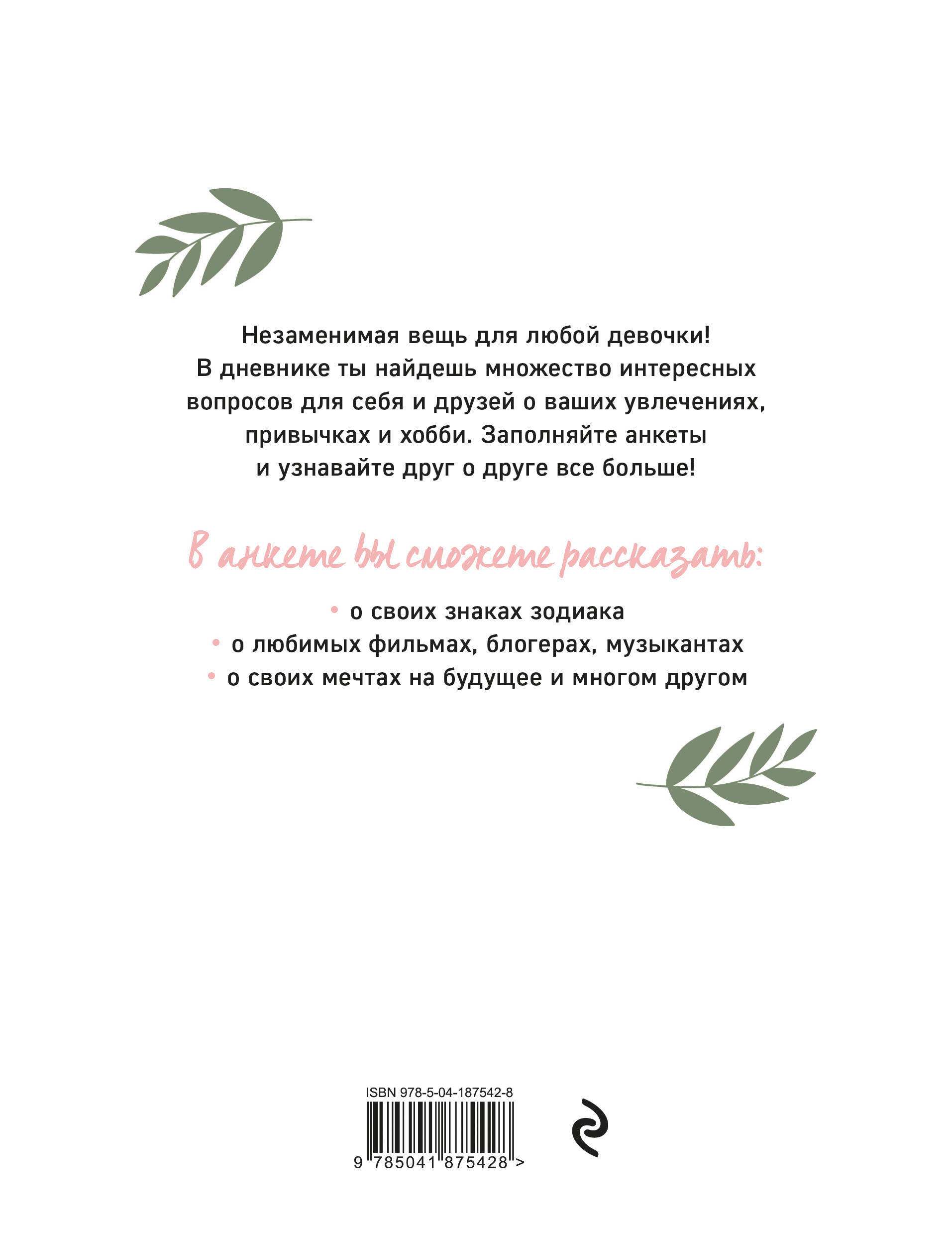 Дневничок с анкетами для друзей станет незаменимым атрибутом для каждой девочки. Это дневник для тех, кто: - хочет лучше узнать своих друзей; - хочет сохранить приятные воспоминая; - любит знакомиться с новыми людьми; - любит составлять и заполнять анкеты. С его помощью вы сможете: - заполнить собственную анкету; - предложить каждому другу заполнить анкету; - сохранить свои впечатления, эмоции и даже секреты. Технические параметры: - удобный формат А5 (162×210 мм); - 96 страниц на офсетной бумаге; - стильная обложка из переплетного картона; - яркий блок. Под стильной обложкой каждую ждет красочный блок и яркие стикеры. Дневник станет отличным подарком для девочки младшего и среднего школьного возраста. А качественные материалы, из которых он выполнен, позволят сохранить записанное в него на долгие годы.| Издательство | ООО "Издательство "Эксмо" |