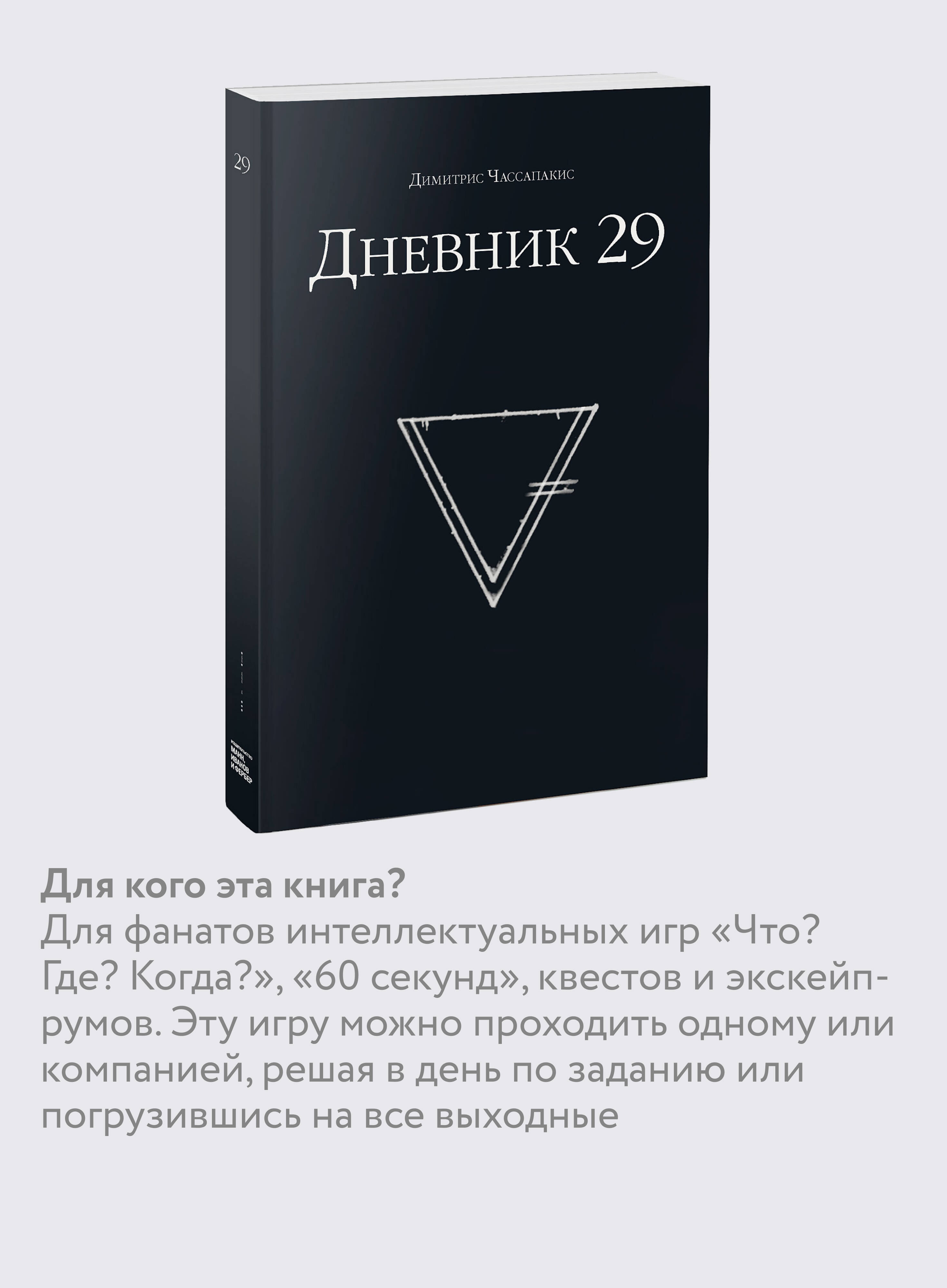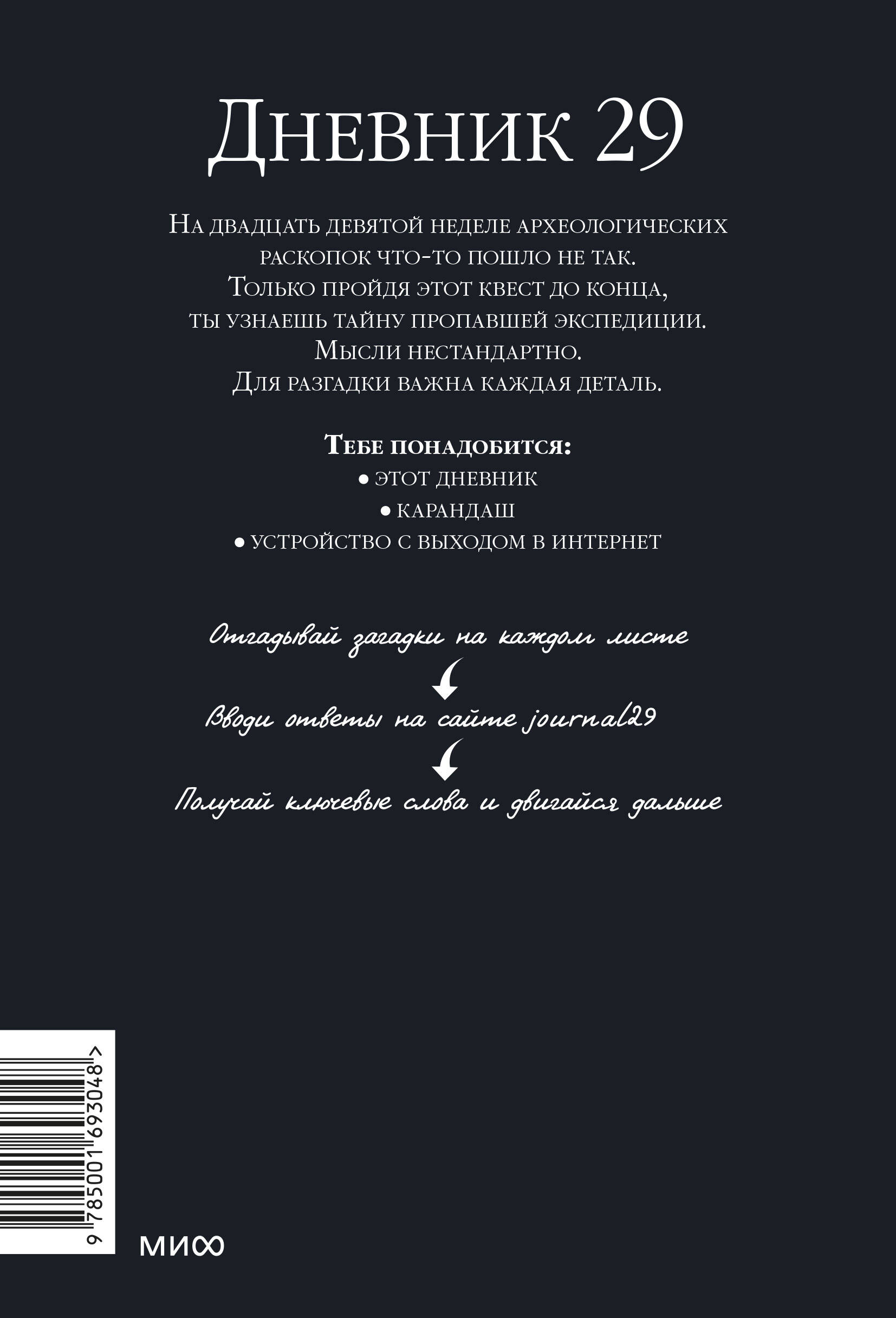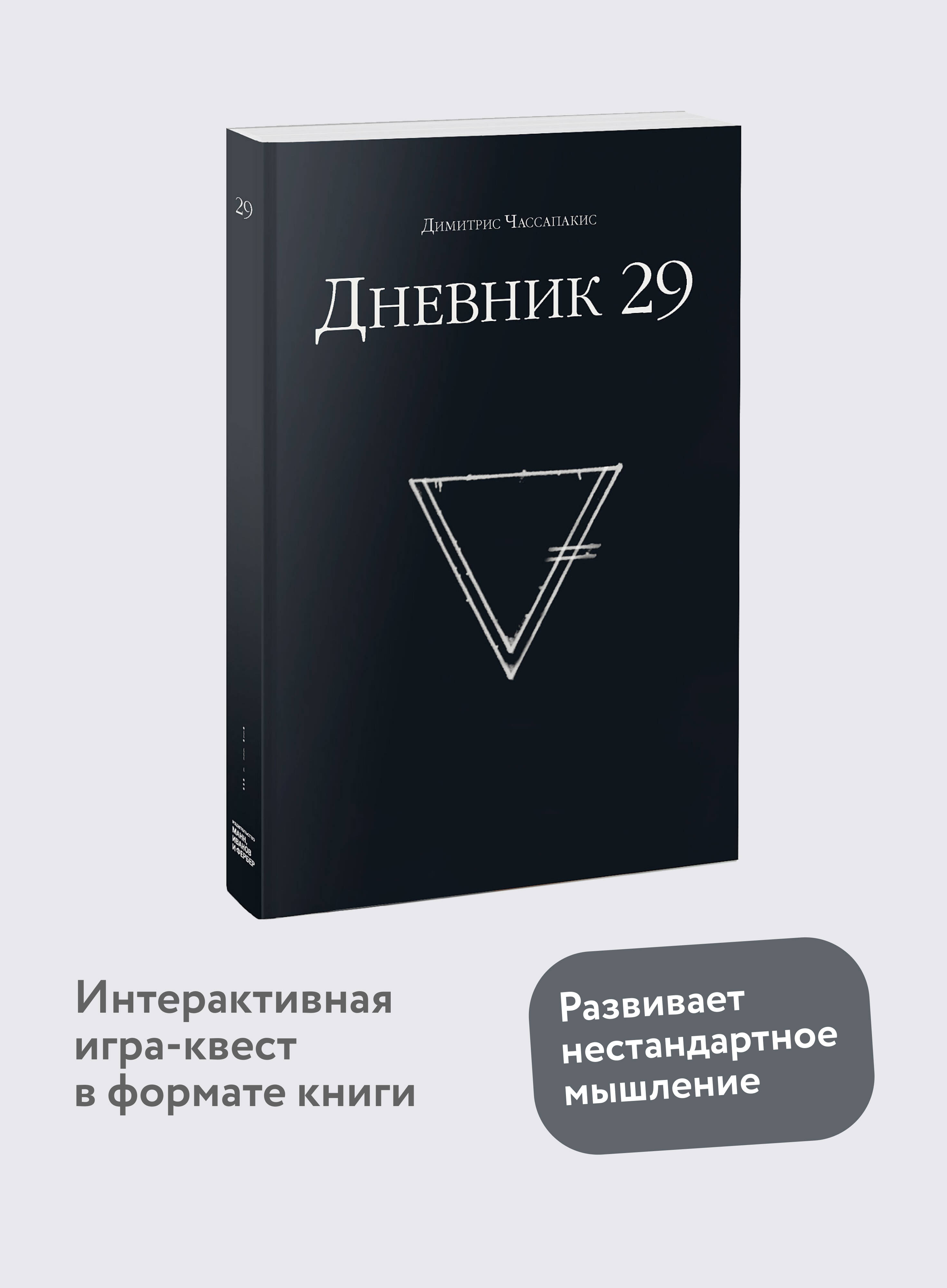 Книга-квест, где читателю предлагается решить 63 головоломки, чтобы разгадать тайну пропавшей археологической экспедиции. Загадки можно решить, только мысля нестандартно. Правильные ответы вбиваются на специальной странице journal29.ru, которая выдает ключи к загадкам.| Издательство | Манн, Иванов и Фербер |