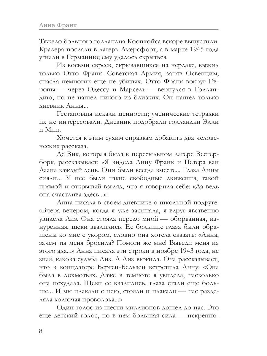 Эта книга не может оставить равнодушным никого. Отбросив нас на 75 лет назад в период нацистской оккупации Нидерландов, дневник Анны Франк поведает о том, как несколько еврейских семей пытались выжить в тайном убежище, скрываясь от гестапо. День за днём еврейская девочка в своём дневнике рассказывает вымышленной ею подруге Китти всё, что происходит с ней и с другими обитателями убежища, записывая в него свои самые сокровенные мысли, горести и радости. Её детская жизнь по воле взрослых быстро стала недетской, превратив дневник девочки в значимый документ и в обвинительный акт. Последняя запись в дневнике датирована 1 августа 1944 года, вскоре гестапо по доносу арестовало всех обитателей убежища. Судьба Анны и её семьи трагична - все погибли в концлагере, лишь одному отцу девочки Отто Франку чудом удалось выжить, после освобождения из концлагеря вернуться в Нидерланды и найти дневник. В 1947 г. Записи были изданы тиражом в 3000 экземпляров. Дневник 6 раз переиздавался и был переведён на 67 языков мира. В 2009 году дневник Анны Франк был признан объектом реестра «Память мира» ЮНЕСКО.| Издательство | Т8 RUGRAM |