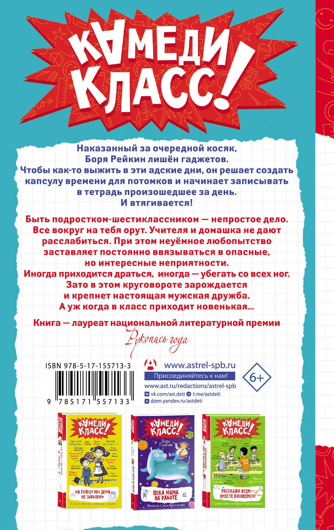 Наказанный за очередной косяк, Боря Рейкин лишён гаджетов. Чтобы как-то выжить в эти адские дни, он решает создать капсулу времени для потомков и начинает записывать в тетрадь произошедшее за день. И втягивается!| Издательство | ИЗДАТЕЛЬСТВО "АСТ" |