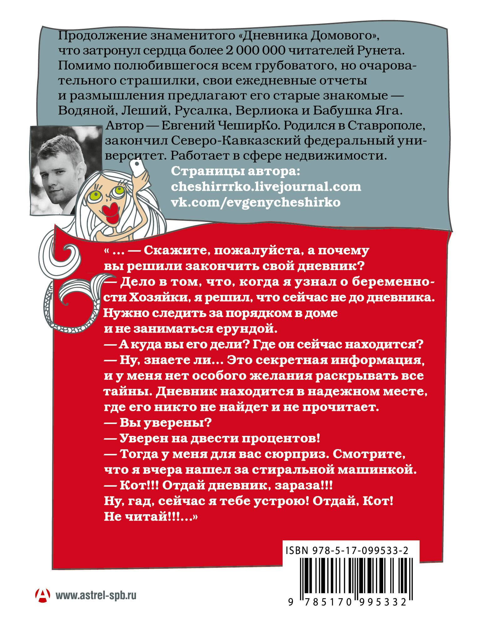 Продолжение знаменитого "Дневника Домового", что затронул сердца более 2 000 000 читателей Рунета. Помимо полюбившегося всем грубоватого, но очаровательного страшилки, свои ежедневные отчеты и размышления предлагают его старые знакомые - Водяной, Леший, Русалка, Верлиока и Бабушка Яга. Автор - Евгений ЧеширКо. Родился в Ставрополе, закончил Северо-Кавказский федеральный университет. Работает в сфере недвижимости.| Издательство | ИЗДАТЕЛЬСТВО "АСТ" |