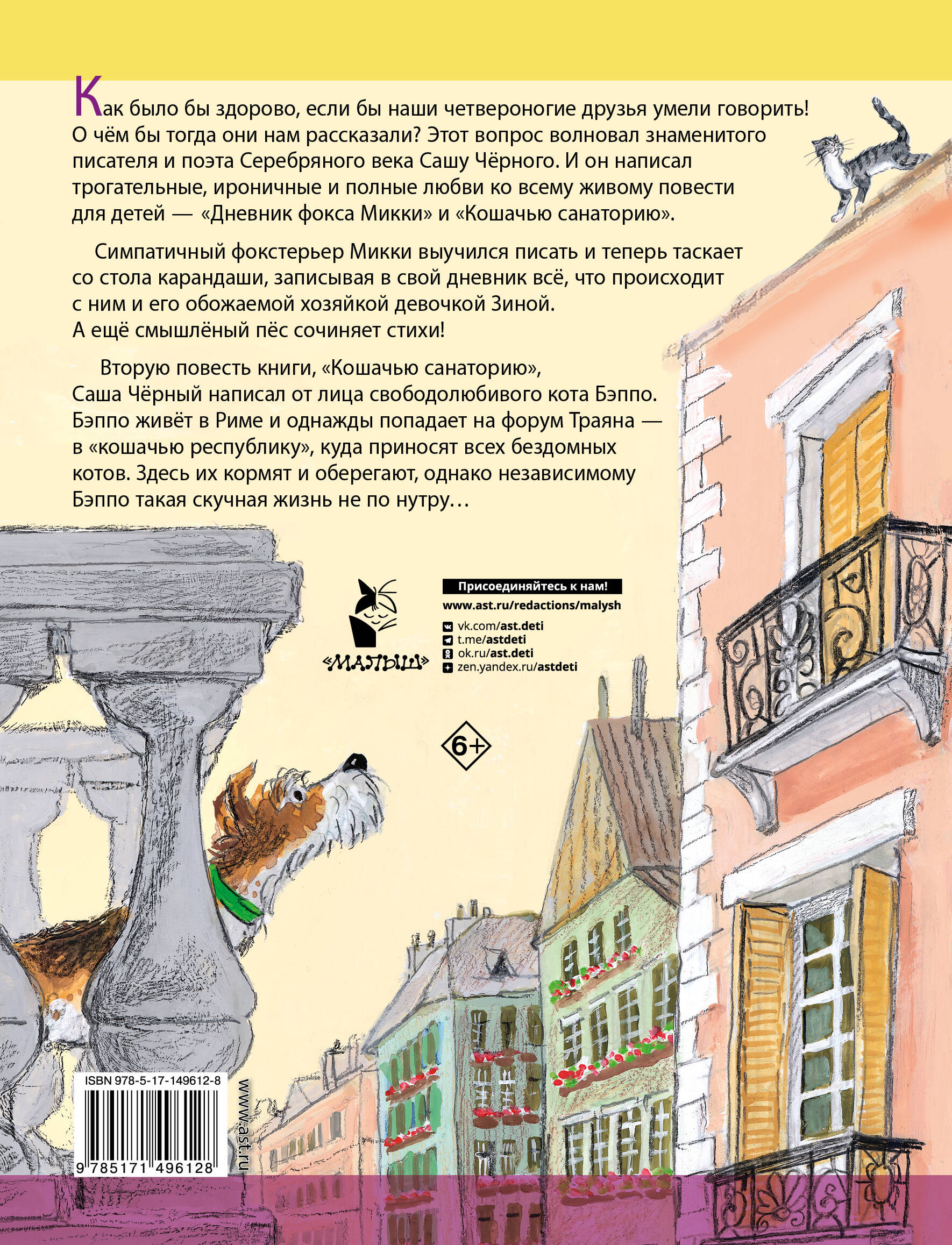 Как было бы здорово, если бы наши четвероногие друзья умели говорить! О чём бы тогда они нам рассказали? Этот вопрос волновал знаменитого писателя и поэта Серебряного века Сашу Чёрного. И он написал трогательные, ироничные и полные любви ко всему живому повести для детей - «Дневник фокса Микки» и «Кошачью санаторию». Симпатичный фокстерьер Микки выучился писать и теперь таскает со стола карандаши, записывая в свой дневник всё, что происходит с ним и его обожаемой хозяйкой девочкой Зиной. А ещё смышлёный пёс сочиняет стихи! Вторую повесть книги, «Кошачью санаторию», Саша Чёрный написал от лица свободолюбивого кота Бэппо. Бэппо живёт в Риме и однажды попадает на форум Траяна - в «кошачью республику», куда приносят всех бездомных котов. Здесь их кормят и оберегают, однако независимому Бэппо такая скучная жизнь не по нутру…| Издательство | АСТ |