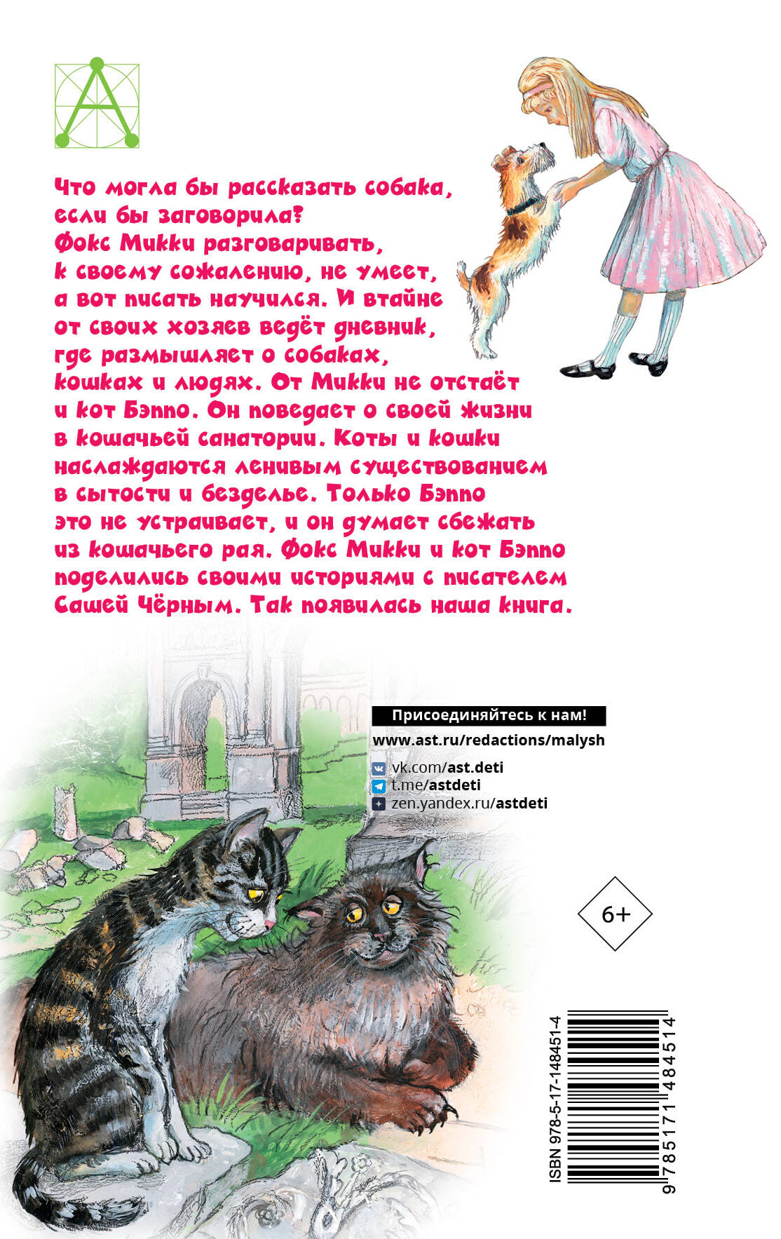 Две знаменитые детские повести Саши Чёрного! В книгу русского поэта, журналиста и писателя Саши Чёрного вошли две повести - «Дневник фокса Микки» и «Кошачья санатория», а также рассказ «Игорь-Робинзон». Что могла бы рассказать собака, если бы заговорила? Фокс Микки разговаривать, к сожалению, не умеет, но зато он ведёт дневник, где размышляет о собаках, кошках и людях. Не отстает от Микки и кот Бэппо, который расскажет маленьким читателям о своей жизни в кошачьей санатории. Как думаете, каково живётся в кошачьем раю? Произведения входят в школьную программу по литературе. Они научат детей быть внимательным к братьям нашим меньшим, следить за своими словами и поступками, стремиться к знаниям. Читайте любимые истории вместе с ребёнком!| Издательство | АСТ |