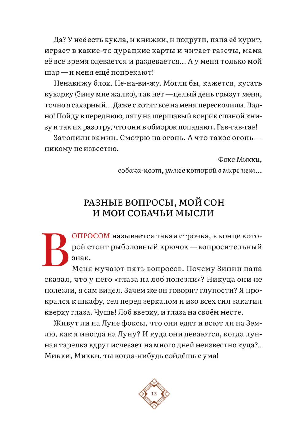 Замечательный поэт и прозаик Серебряного века Саша Чёрный (настоящее имя Александр Гликберг) создал удивительного героя, фокстерьера по кличке Микки, который научился читать и писать, сочинять стихи и называет себя «самым умным из зверей». А ещё он мечтает и фантазирует, представляет, как бы изменился мир вокруг, если бы существовали кино, цирк и другие развлечения для собак, и ведёт дневник, где делится забавными наблюдениями, рассказывает о своих хозяевах и окружающем мире, каким он его видит. Помимо повести «Дневник фокса Микки» в сборник также вошли рассказы писателя о животных - чудесные, добрые и наивные истории, вызывающие улыбку. Отзывчивость и душевность героев настолько заразительны, что хочется возвращаться к ним снова и снова.| Издательство | Городец |