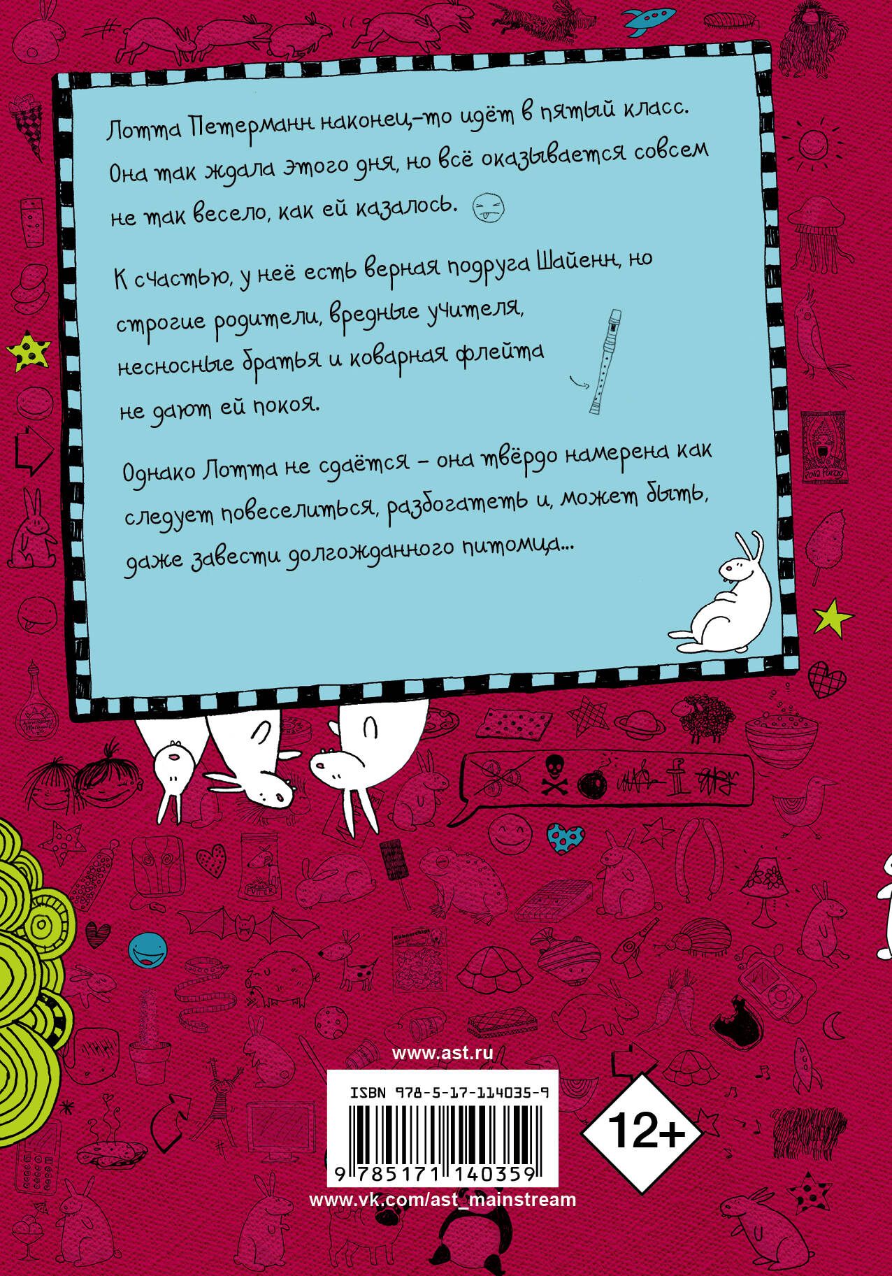 Лотта Петерманн наконец-то идёт в пятый класс. Она так ждала этого дня, но всё оказывается совсем не так весело, как ей казалось. К счастью, у неё есть верная подруга Шайенн, но строгие родители, вредные учителя, несносные братья и коварная флейта не дают ей покоя. Однако Лотта не сдаётся - она твёрдо намерена как следует повеселиться, разбогатеть и, может быть, даже завести долгожданного питомца...