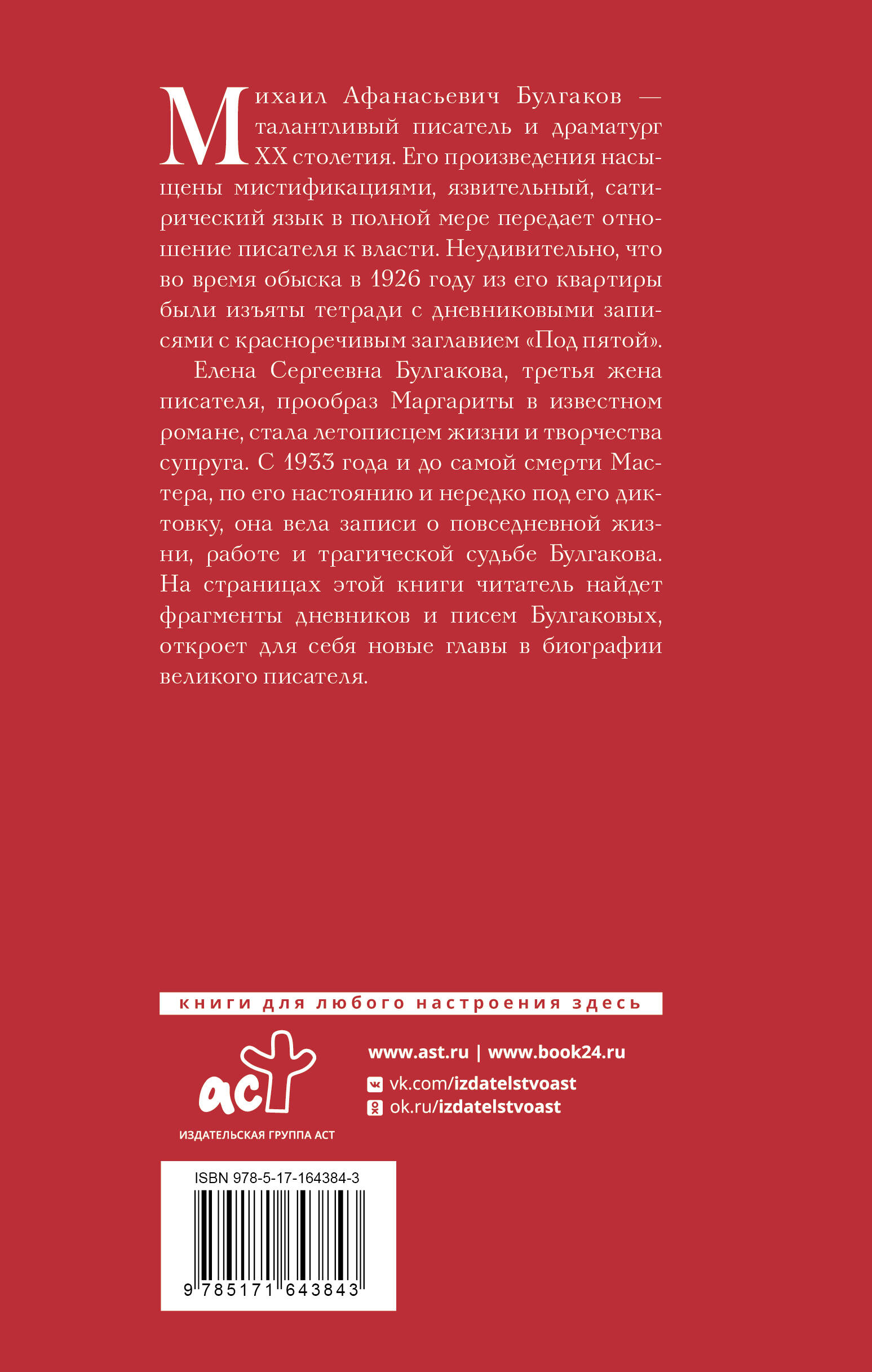 Михаил Афанасьевич Булгаков - талантливый писатель и драматург XX столетия. Его произведения насыщены мистификациями; язвительный, сатирический язык в полной мере передает отношение писателя к власти. Неудивительно, что во время обыска в 1926 году из его квартиры были изъяты тетради с дневниковыми записями с красноречивым заглавием "Под пятой". Елена Сергеевна Булгакова, третья жена писателя, прообраз Маргариты в известном романе, стала летописцем жизни и творчества супруга. С 1933 года и до самой смерти Мастера, по его настоянию и нередко под его диктовку, она вела записи о повседневной жизни, работе и трагической судьбе Булгакова. На страницах этой книги читатель найдет фрагменты дневников и писем Булгаковых, откроет для себя новые главы в биографии великого писателя.| Издательство | Издательство "АСТ" |