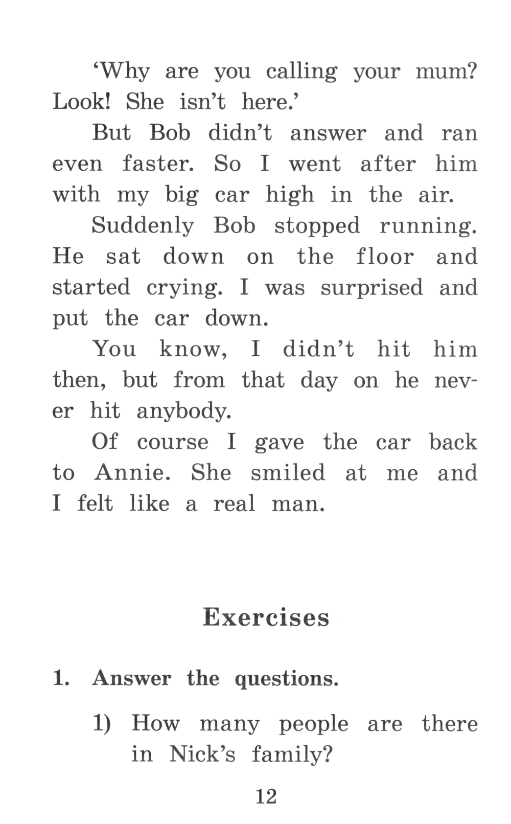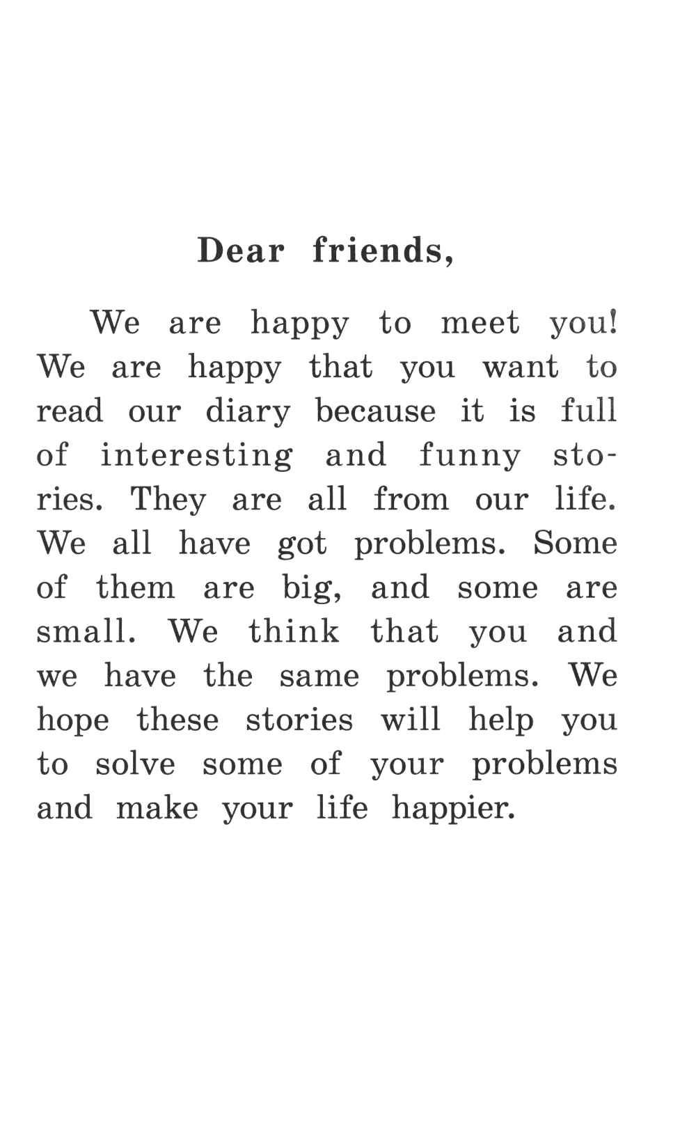 Книга представляет собой сборник занимательных историй, о которых рассказали в своём дневнике Ник и его сестра Пэт. Они делятся с читателями своими воспоминаниями, в которых повествуют и о серьёзных и о забавных проблемах, возникающих на их жизненном пути, и о том, как взрослые (чаще всего мама или папа) помогают им найти выход из самых затруднительных ситуаций. Эта книга о том, как велика роль семьи в жизни каждого ребёнка. Каждая глава снабжена упражнениями, направленными на развитие навыков речи и отработку грамматики. Пособие адресовано учащимся 4 классов школ, лицеев и гимназий. Книга содержит англо-русский словарь, соответствующий данному этапу обучения.
