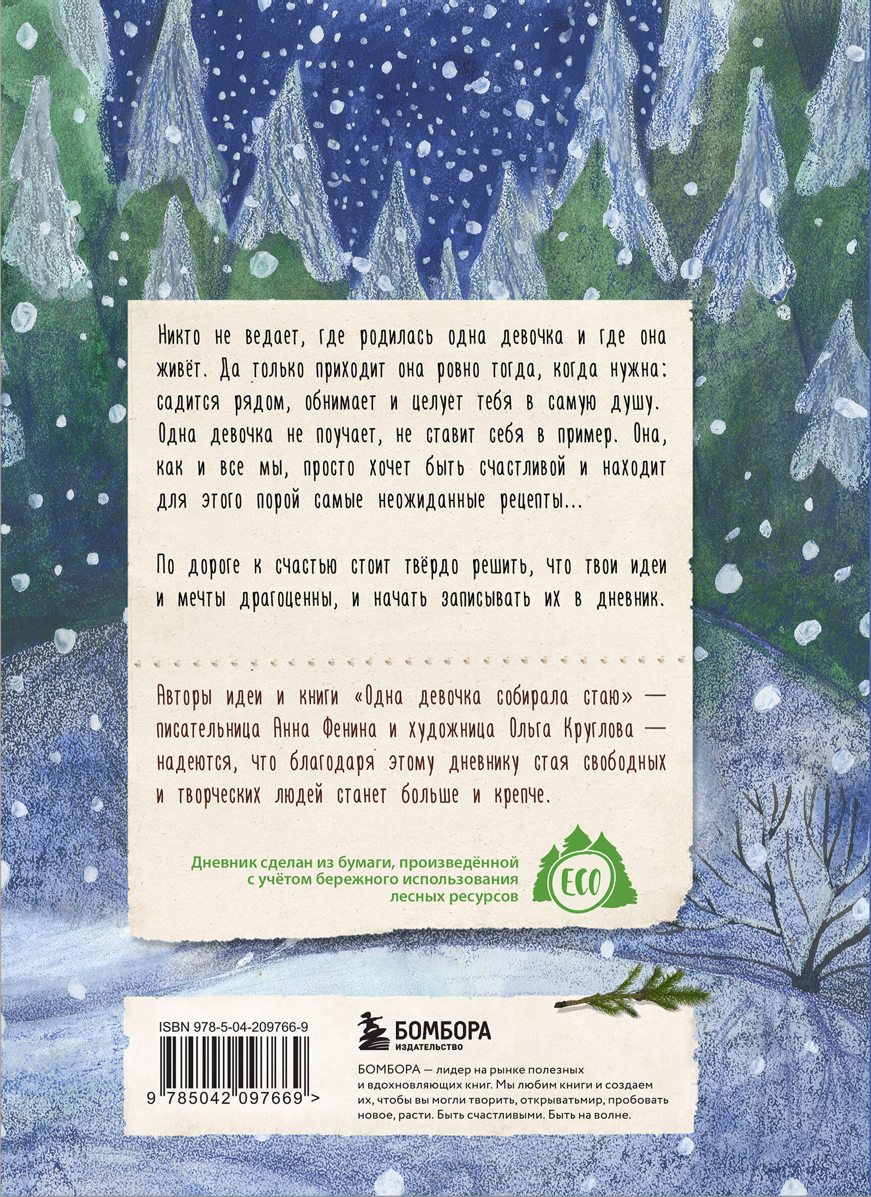 По дороге к счастью стоит твёрдо решить, что твои идеи и мечты драгоценны, и начать записывать их в дневник, на котором таинственно поблескивают смешинки и снежинки. Авторы идеи и книги «Одна девочка собирала стаю» - писательница Анна Фенина и художница Ольга Круглова - надеются, что благодаря этому дневнику стая свободных и творческих людей станет больше и крепче. Никто не ведает, где родилась Одна Девочка и где она живёт. Да только приходит она ровно тогда, когда нужна: садится рядом, обнимает и целует тебя в самую душу. Одна Девочка не поучает, не ставит себя в пример. Она, как и все мы, просто хочет быть счастливой и находит для этого порой самые неожиданные рецепты...| Издательство | ООО "Издательство "Эксмо" |