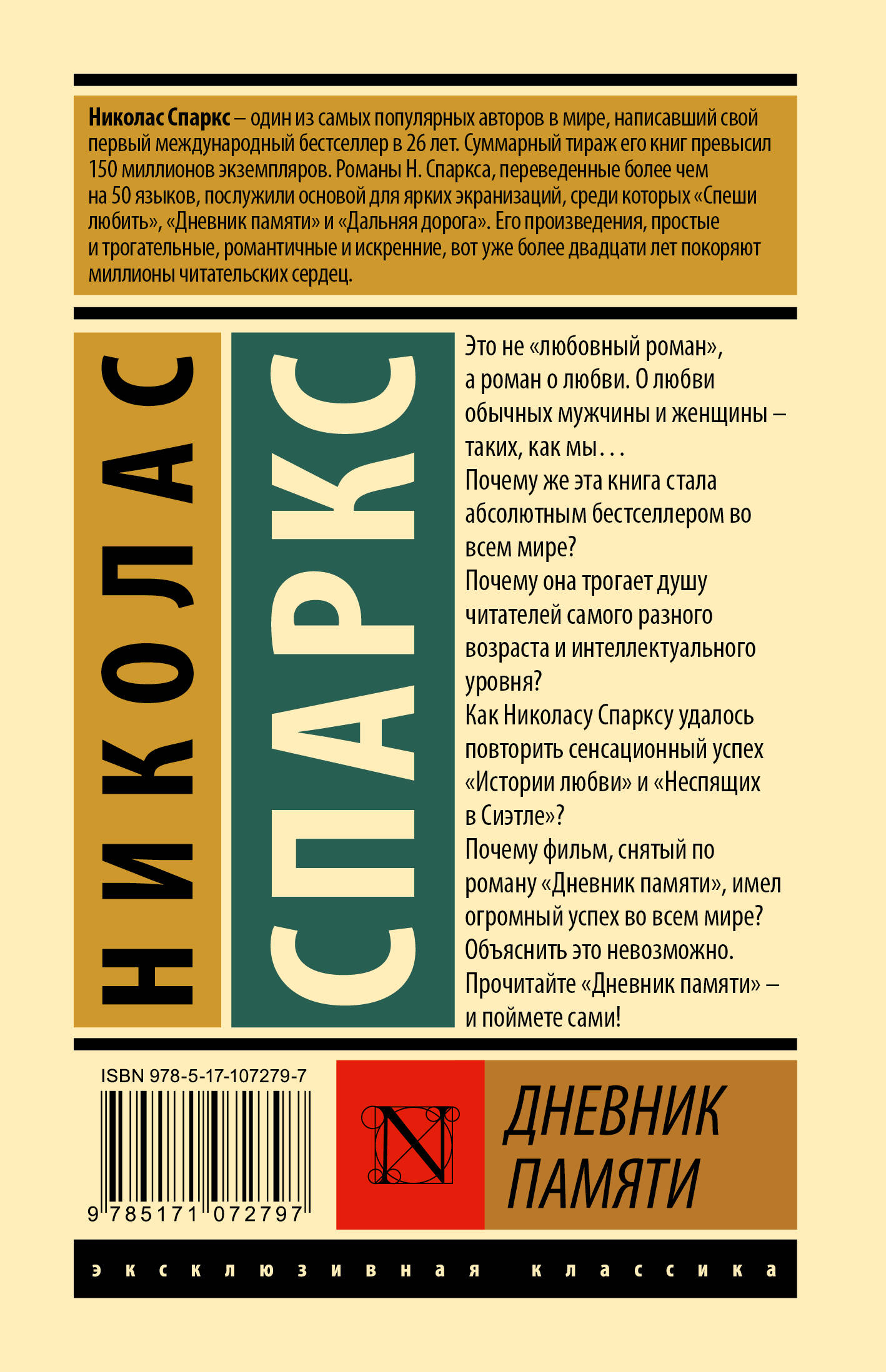 Это - не "любовный роман", а роман о любви. О любви обычных мужчины и женщины - таких, как мы… Почему же эта книга стала абсолютным бестселлером во всем мире? Почему она трогает душу читателей самого разного возраста и интеллектуального уровня? Как Николасу Спарксу удалось повторить сенсационный успех "Истории любви" и "Неспящих в Сиэтле"? Почему фильм, снятый по роману "Дневник памяти", имел огромный успех во всем мире? Объяснить это невозможно. Прочитайте "Дневник памяти" - и поймете сами!| Издательство | ИЗДАТЕЛЬСТВО "АСТ" |