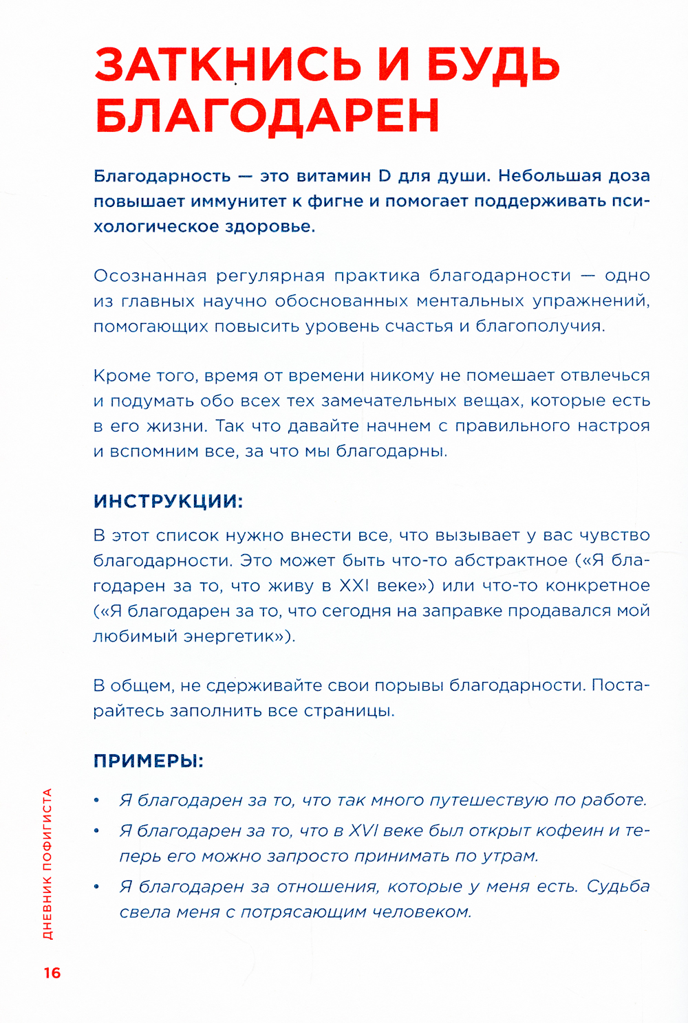 В бестселлере «Тонкое искусство пофигизма» Марк Мэнсон рассказывает о том, что избежать мелких неудач и больших провалов невозможно, как ни старайся, поэтому на них надо просто забить и жить счастливо. После выхода книги читатели завалили Мэнсона вопросами в духе: «Марк, а как научиться пофигизму? С чего начать?» Чтобы помочь всем желающим, он написал «Дневник пофигиста», который вы и держите в руках. Это простой и остроумный дневник саморефлексии в пяти частях, который поможет понять, что для вас по-настоящему важно, и перестать беспокоиться по поводу всего остального. Готовых решений и волшебных рецептов в дневнике не найти. Зато на его страницах достаточно места, чтобы вы как следует поразмыслили о своих взлетах и падениях, подготовили план действий на будущее и составили пару симпатичных списков (в том числе и список фигни, на которую можно забить). А главное - никто, включая автора, не будет вам ничего навязывать. Вы сами научитесь принимать неизбежность проблем, перестанете идти на поводу у своих эмоций, разберетесь, на что тратите свое время, и поймете, о чем стоит беспокоиться, а на что можно и наплевать. Ведь цель этого дневника - помочь вам овладеть тонким искусством пофигизма.| Издательство | Альпина Паблишер |