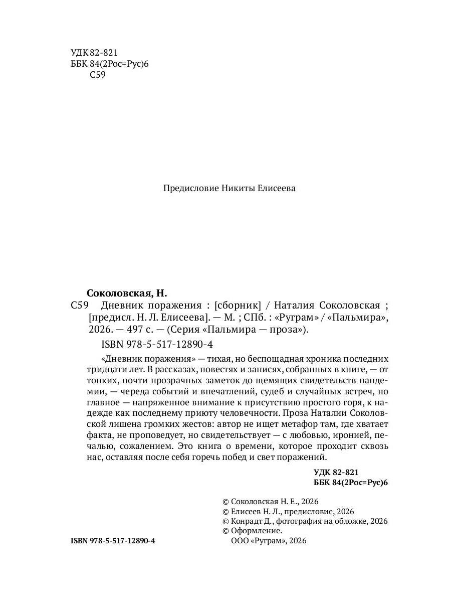 «Дневник поражения» - тихая, но беспощадная хроника последних тридцати лет. В рассказах, повестях и записях, собранных в книге - от тонких, почти прозрачных заметок до щемящих свидетельств пандемии, - череда событий и впечатлений, судеб и случайных встреч, но главное - напряженное внимание к присутствию простого горя, к надежде как последнему приюту человечности. Проза Наталии Соколовской лишена громких жестов: автор не ищет метафор там, где хватает факта, не проповедует, но свидетельствует - с любовью, иронией, печалью, сожалением. Это книга о времени, которое проходит сквозь нас, оставляя после себя горечь побед и свет поражений.| Издательство | Т8 RUGRAM |