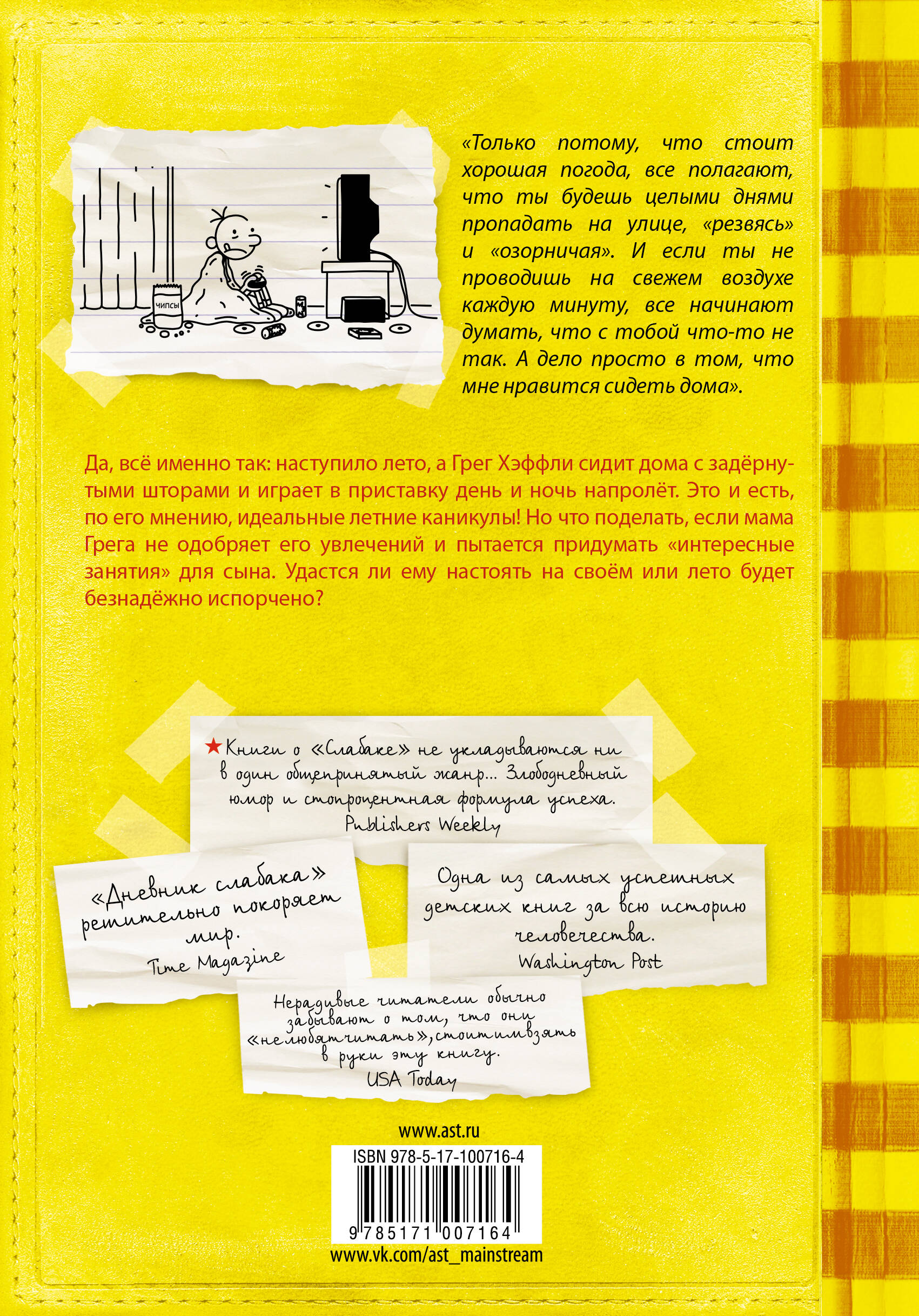 Первая же книга Джеффа Кинни из серии «Дневник слабака» стала бестселлером New York Times, была экранизирована и принесла своему автору славу одного из самых многообещающих детских писателей. Благодаря успеху следующих книг Кинни занял место в списке ста самых влиятельных людей мира по версии журнала Time. Но главное - завоевал сердца десятков миллионов юных поклонников по всему миру. Секрет такого успеха заключается, во-первых, в фигуре Грега Хэффли, главного героя цикла. Он обычный школьник, не надуманный и не сказочный, с такими понятными и знакомыми всем проблемами, страхами, переживаниями и мечтами. Во-вторых, в живом и ироничном языке, обилии остроумных наблюдений и веселых заметок. Ну, а в-третьих - в замечательных иллюстрациях, которые являются неотъемлемой частью повествования и напрямую включены в сюжет. Недаром Джефф Кинни - не только всемирно известный писатель, но и талантливый карикатурист. В книге «Собачья жизнь» собрано все то, из-за чего цикл «Дневник слабака» стал настоящим мировым бестселлером. Это все тот же легкий слог, море остроумия, смешные иллюстрации и, конечно, неунывающий Грег Хэффли. На этот раз Грег переживает удивительные приключения во время летних каникул. Здесь будет и поездка в аквапарк всей семьей, и безуспешная попытка разбогатеть, и даже появление в доме собаки. Скучать не придется!| Издательство | ИЗДАТЕЛЬСТВО "АСТ" |