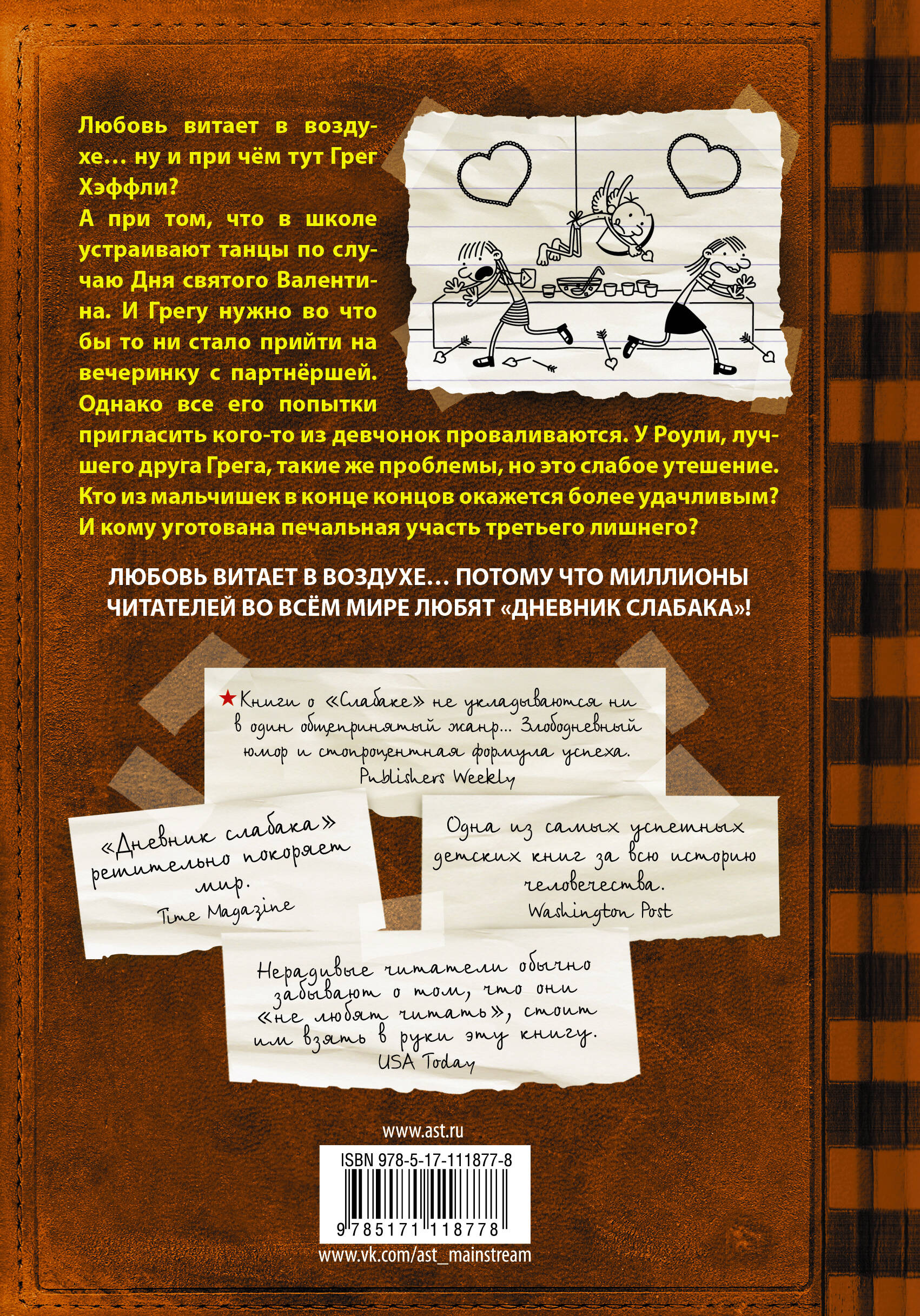 Любовь витает в воздухе… ну и при чём тут Грег Хэффли? А при том, что в школе устраивают танцы по случаю Дня святого Валентина. И Грегу нужно во что бы то ни стало прийти на вечеринку с партнёршей. Однако все его попытки пригласить кого-то из девчонок проваливаются. У Роули, лучшего друга Грега, такие же проблемы, но это слабое утешение. Кто из мальчишек в конце концов окажется более удачливым? И кому уготована печальная участь третьего лишнего?| Издательство | ИЗДАТЕЛЬСТВО "АСТ" |