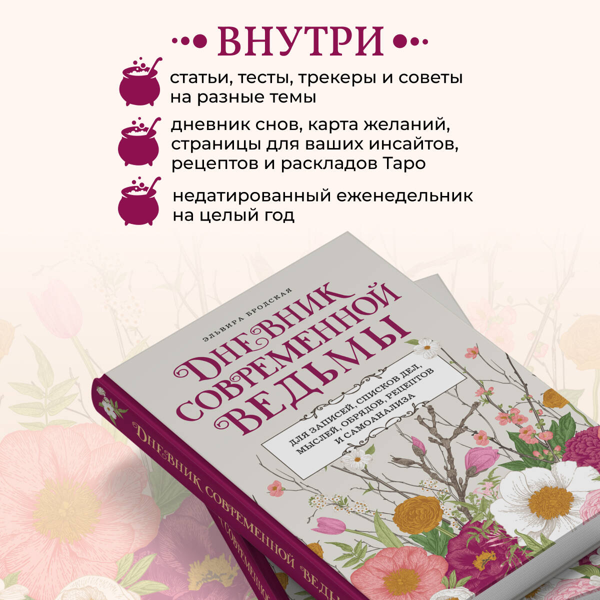 «Дневник современной ведьмы» - синтез Книги Теней, личного дневника и журнала для заметок, где вы станете и читателем, и соавтором, и творцом своего волшебного мира. Внутри - статьи, тесты, трекеры и советы на разные темы, составляющие собой важные вехи духовной жизни ведьмы. Часть страниц оставлена пустой - заполнить их предстоит вам. Таро, магия мысли и аффирмации, травы и минералы, история ведьмовства и виды ведьм, Колесо Года и духовное здоровье, лунные циклы и защитная магия, и даже «немагические» способы влияния на состояние - всему нашлось место! Вторая половина «Дневника» - недатированный еженедельник для фиксации планов и результатов недели и всего, что вы посчитаете нужным, от карты недели до текущих задач, от лунного дня до эмоций и ощущений. Регулярное использование «Дневника» усилит вашу внутреннюю ведьму, поможет делать все в срок и уместить духовные практики и инсайты в бурный ритм современной жизни. Сочетание полезных материалов и пространства для творчества позволит очистить разум от информационного мусора, заземлиться и организовать мысли - бесценно в век цифровизации. А красивое оформление в стиле учебника волшебной школы с первых страниц создаст неповторимую атмосферу. Автор-составитель «Дневника» - Эльвира Бродская, современная ведьма и хозяйка проекта «Волшебная Кладовая», автор книги «Магия очищения и защиты: от психоэнергетической гигиены до настоящего волшебства». В сети известная как vk_wonder. В книге вас ждет бонус от автора - QR-код, где вы найдете подарки и материалы для распечатки: ведьмовские стикеры-напоминалки, список дел для ведьмы на каждый день, этикетки для волшебных бутылочек и коробочек, авторскую аудиомедитацию и первую главу книги «Магия очищения и защиты».| Издательство | ООО "Издательство "Эксмо" |