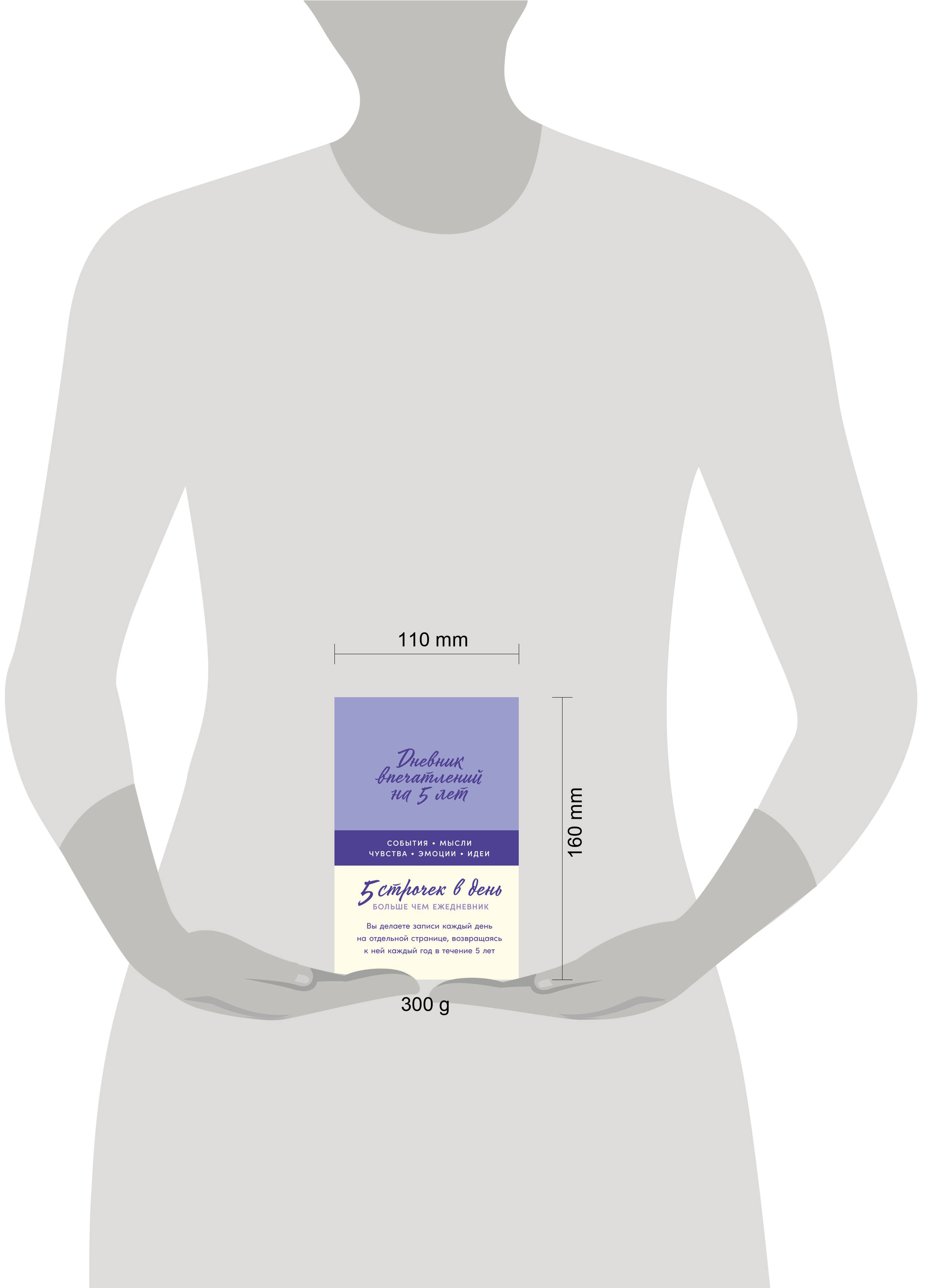 "Дневник впечатлений на 5 лет" создан для того, чтобы вы могли записывать что-то особенное о каждом дне. Хотите ли вы зафиксировать свои достижения, мысли, идеи или красоту момента, оставить на будущее важные размышления, заметить перемены и задуматься о главном - дневник идеально для этого подойдет. Каждая страница дневника - один календарный день. Начните с любой даты и просто делайте записи ежедневно в течение 5 лет. Возвращаясь к уже заполненным страницам, вы снова вспомните события, мысли и впечатления той же даты год, два, три, четыре, пять лет назад. Особенности Экологичный материал на обложке, тиснение фольгой. Крашеный обрез, закладка-ляссе; Недатированный: можно использовать, начиная с любого дня года; Рассчитан на 5 лет; Размер 95×155 мм, 192 листа. Для кого Для тех, кто хочет фиксировать красоту момента, повышать осознанность, замечать и запоминать важные события в жизни и чувствовать себя счастливее.