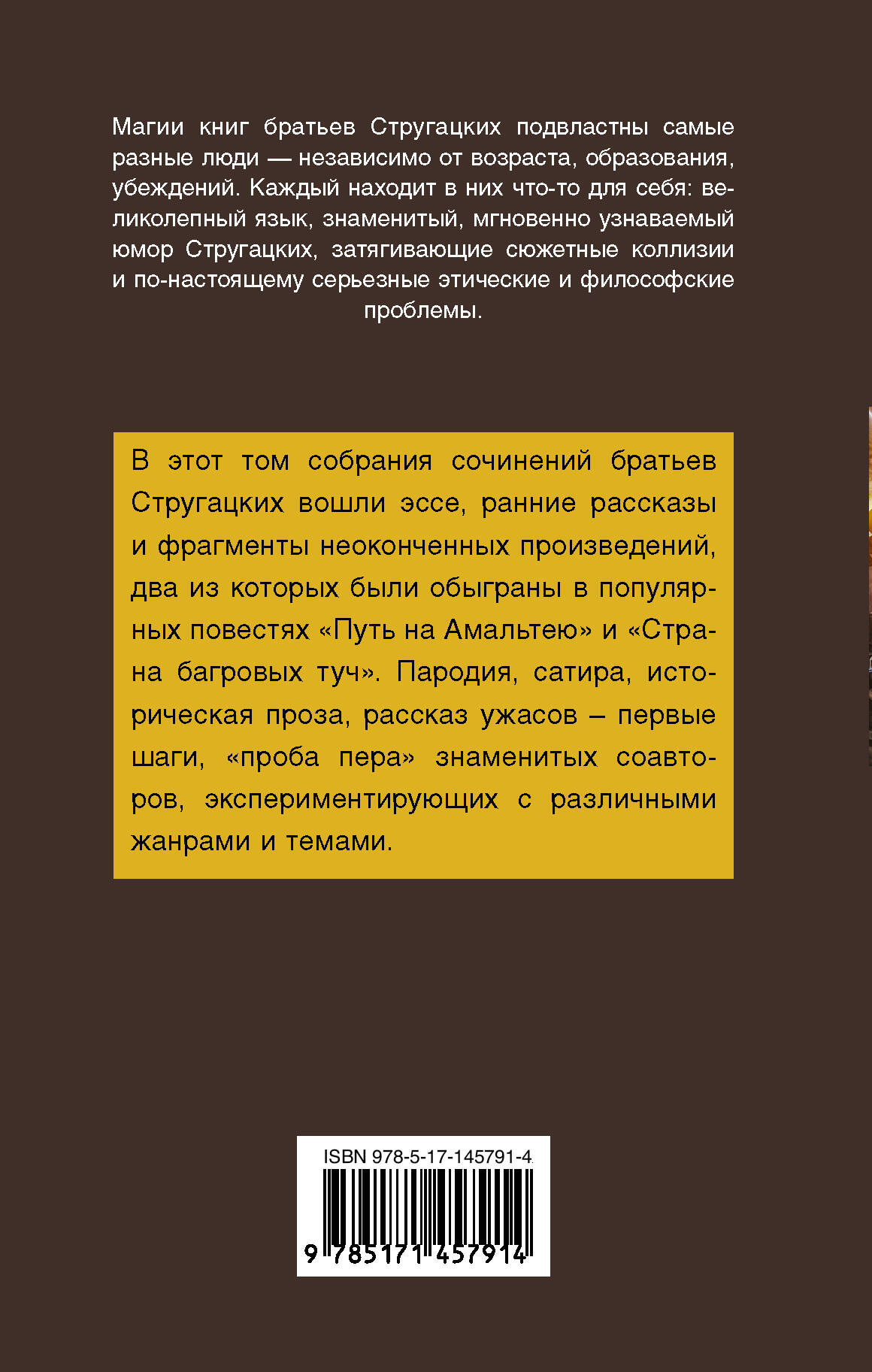 В этот том собрания сочинений братьев Стругацких вошли эссе, ранние рассказы и фрагменты неоконченных произведений, два из которых были обыграны в популярных повестях "Путь на Амальтею" и "Страна багровых туч". Пародия, сатира, историческая проза, рассказ ужасов - первые шаги, "проба пера" знаменитых соавторов, экспериментирующих с различными жанрами и темами.| Издательство | Издательство "АСТ" |
