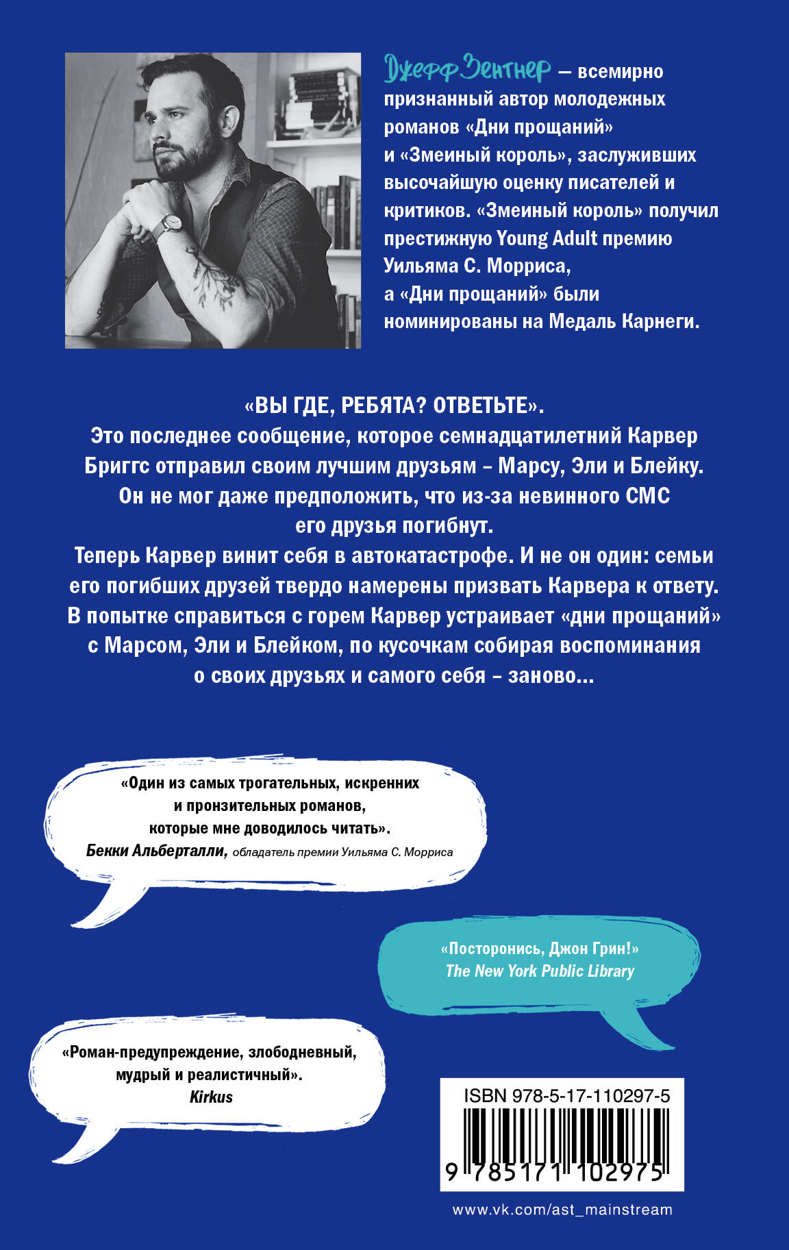 "Вы где, ребята? Ответьте". Это последнее сообщение, которое семнадцатилетний Карвер Бриггс отправил своим лучшим друзьям Марсу, Эли и Блейку. Он не мог даже предположить, что из-за невинного смс его друзья погибнут. Теперь Карвер винит себя в автокатастрофе. И не он один - семьи его погибших друзей твердо намерены призвать Карвера к ответу. В попытке справиться с горем Карвер устраивает "дни прощаний" с Марсом, Эли и Блейком, по кусочкам собирая воспоминания о своих друзьях и самого себя - заново…| Издательство | ИЗДАТЕЛЬСТВО "АСТ" |